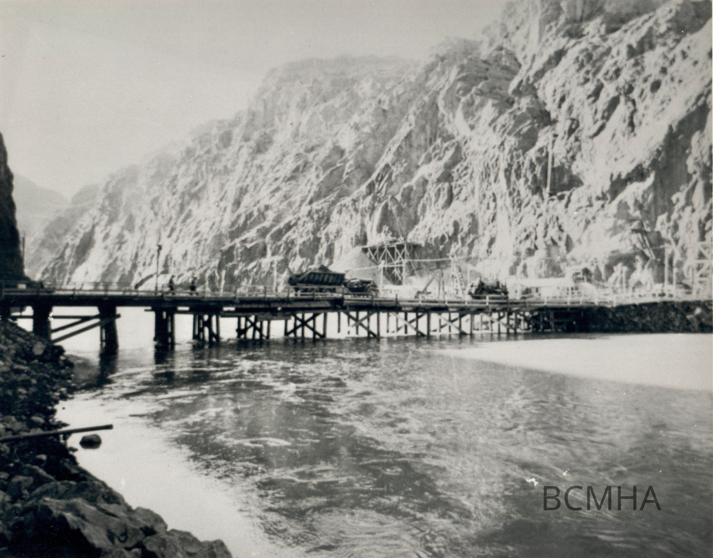 Hoover Dam construction: "Starting to build the coffer dam. Bridge used to dump load after load of rock into river." c. Nov. 1932; 0123 0093 folder 123 Ray Cutright Collection; UNLV Library - Special Collections Copy Negative; USBR photoCollection