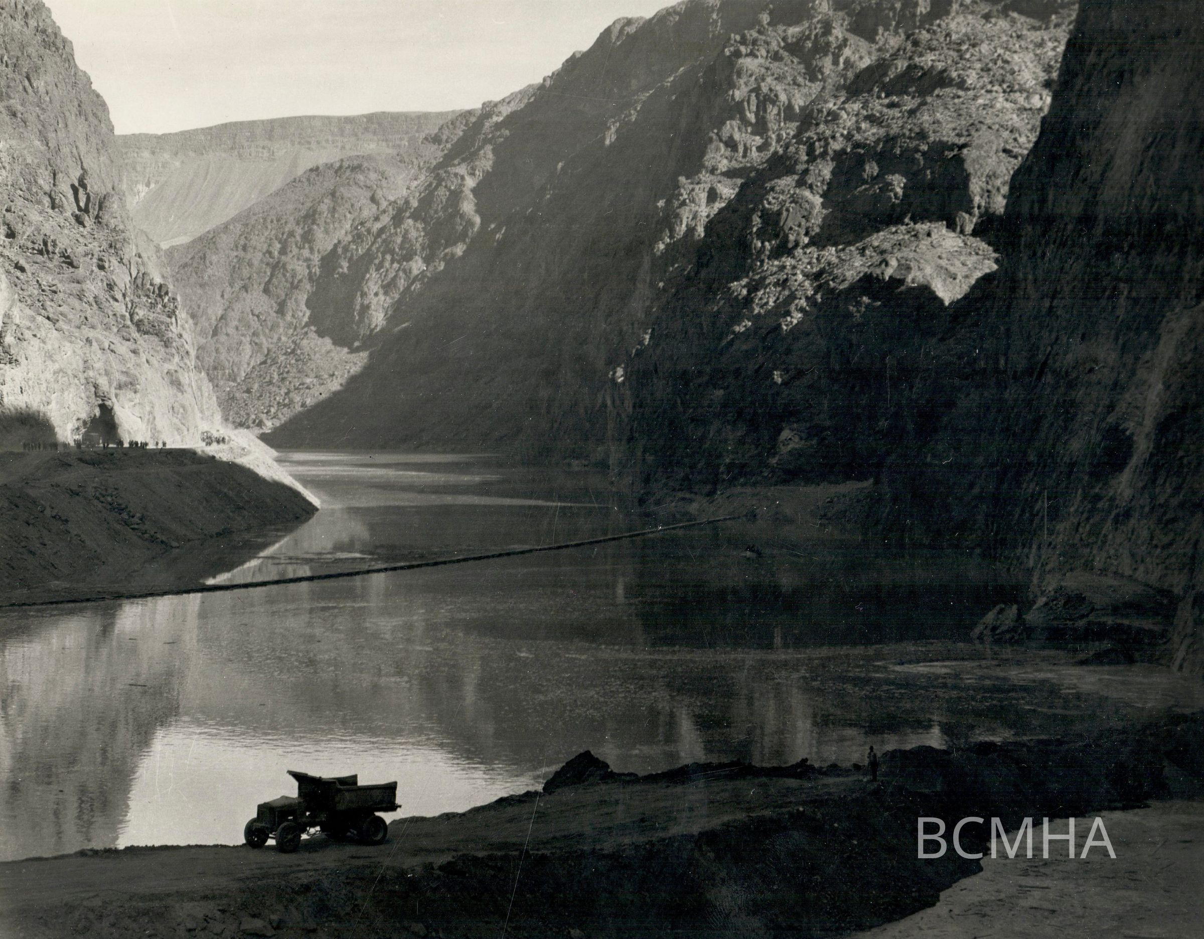 Hoover Dam construction: "Looking upstream from upstream cofferdam during time when entire flow of river was being retained in reservoir." February 3, 1935; Water and Power Resources Service; B. D. Glaha, photographer; USBR photo P45-301-2883Collection