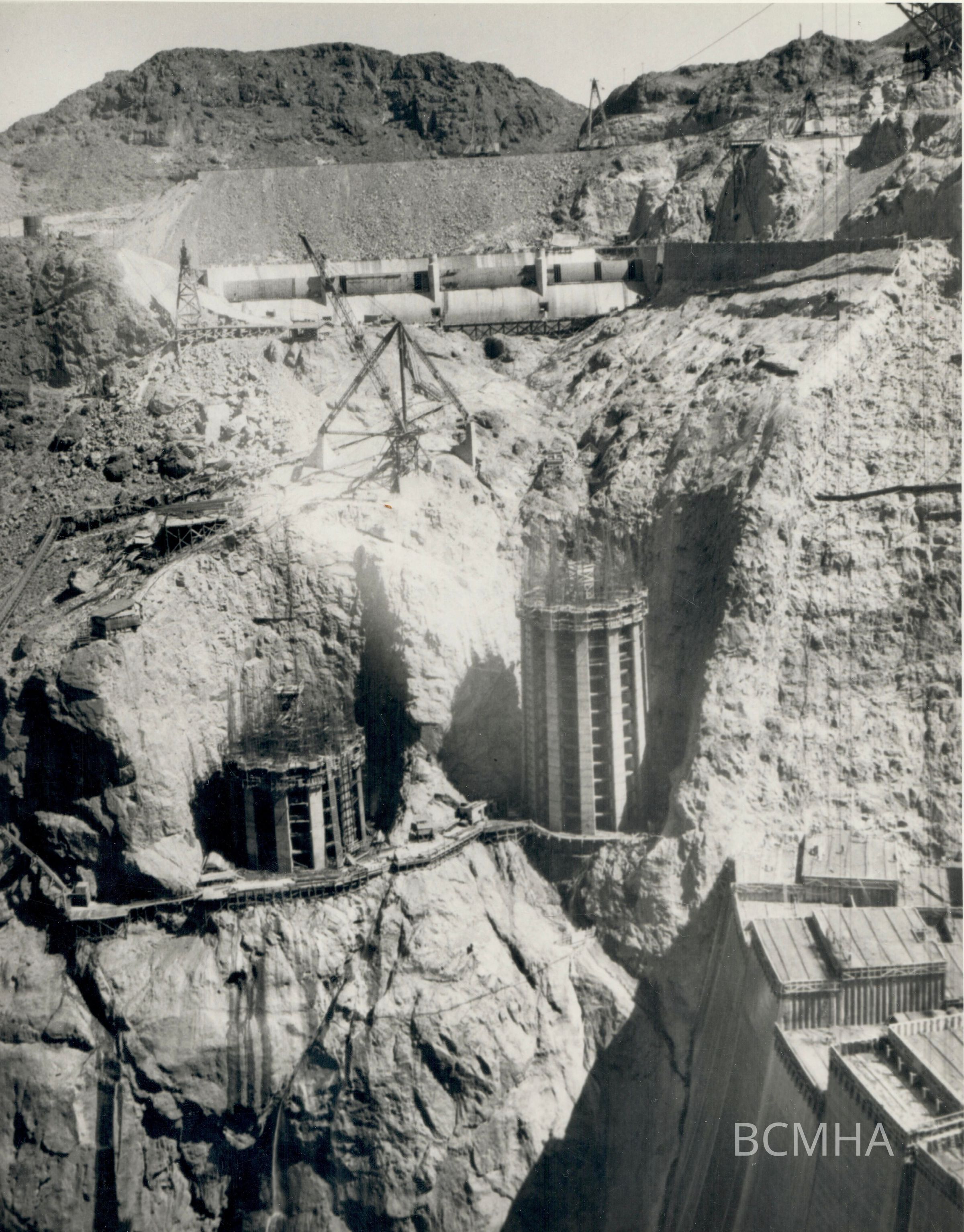 Hoover Dam - construction: "Arizona intake towers from the Nevada side." 5-29-34; W. A. Bechtel Collection Photo #2710 - Volume Three; Roll 36 - Photo No. 9 Copy Negative - Bureau of ReclamationCollection