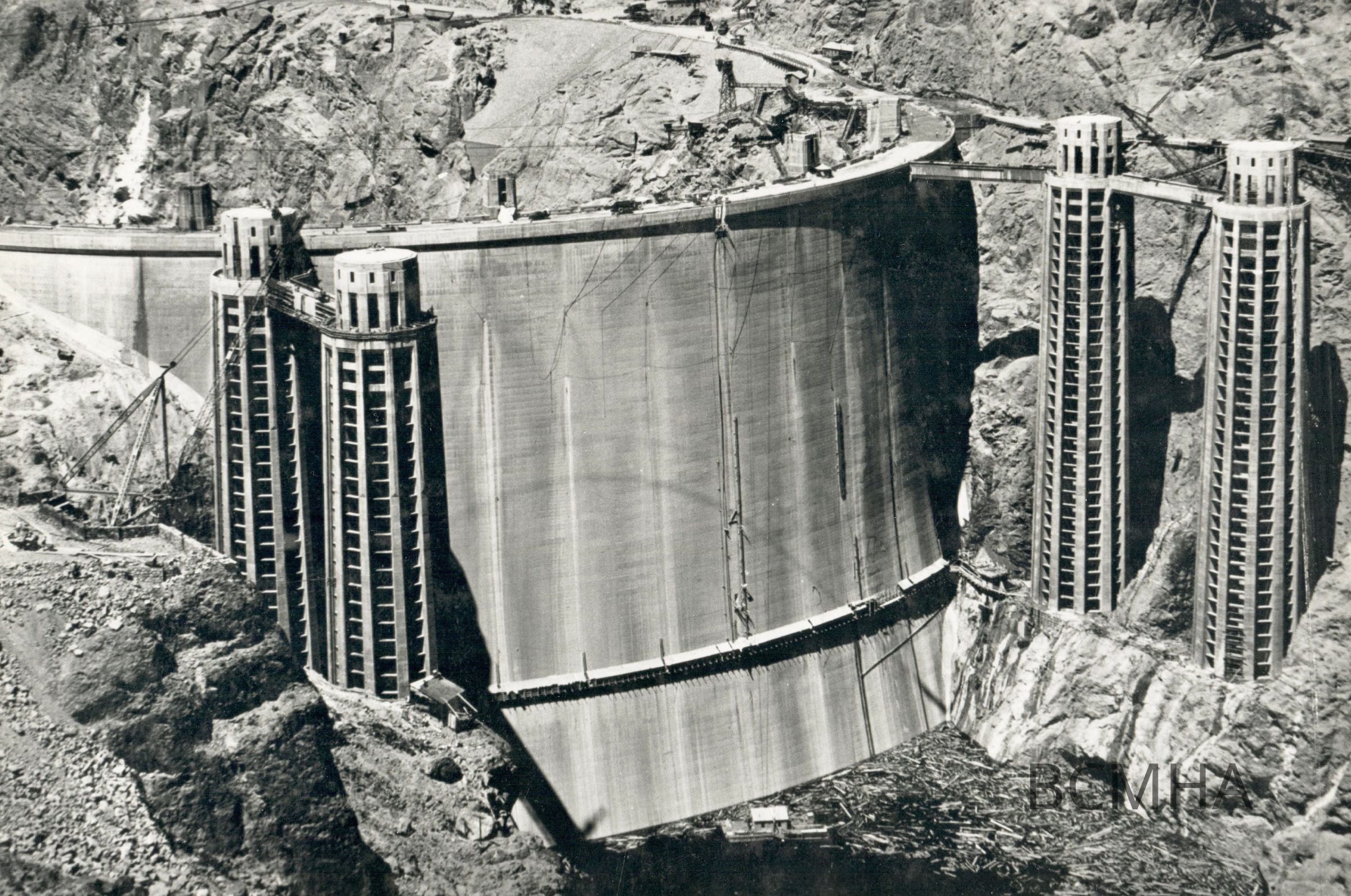 Hoover Dam - construction: "The upstream face of the dam and appurtenant works as seen from high point upstream on the Arizona rim of Black Canyon. Water surface at elevation 790." 5-22-35; B. D. Glaha, photographer; Bureau of Reclamation photo/Wash. No. 3146Collection