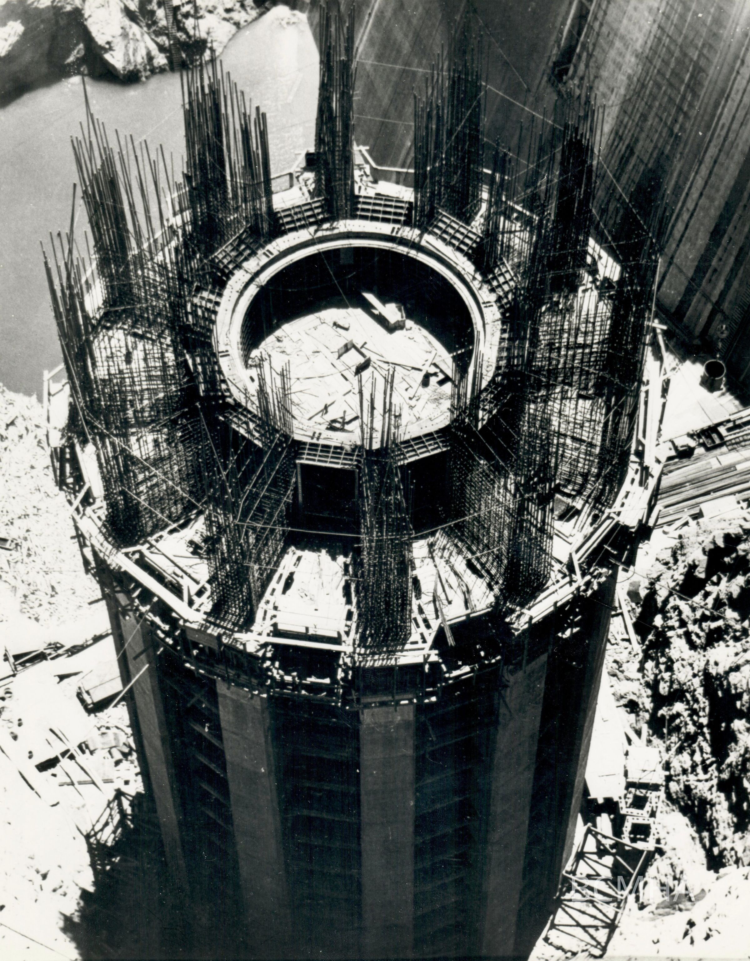 Hoover Dam construction: "Looking down onto upstream Nevada Intake Tower from construction trestle above. View shows the installation of upper ring gate in tower." 7/20/34; B. D. Glaha, photographer; Bureau of Reclamation photo/BCP 02584Collection