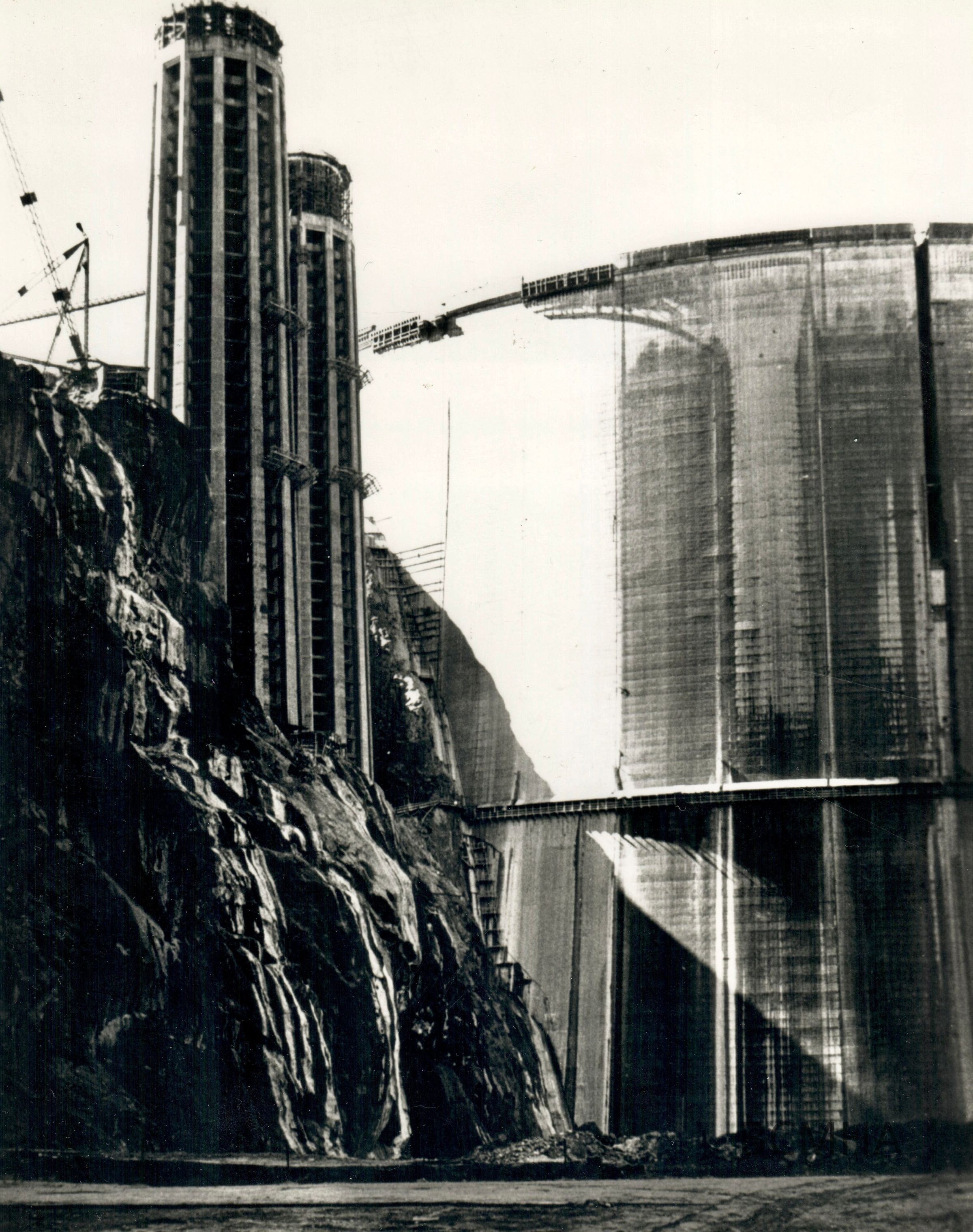 Hoover Dam construction: "Arizona side of the dam and Intake Towers as seen from crest of upstream cofferdam." 2-28-35; B. D. Glaha, photographer; Bureau of Reclamation photo/Wash. No. 02917Collection