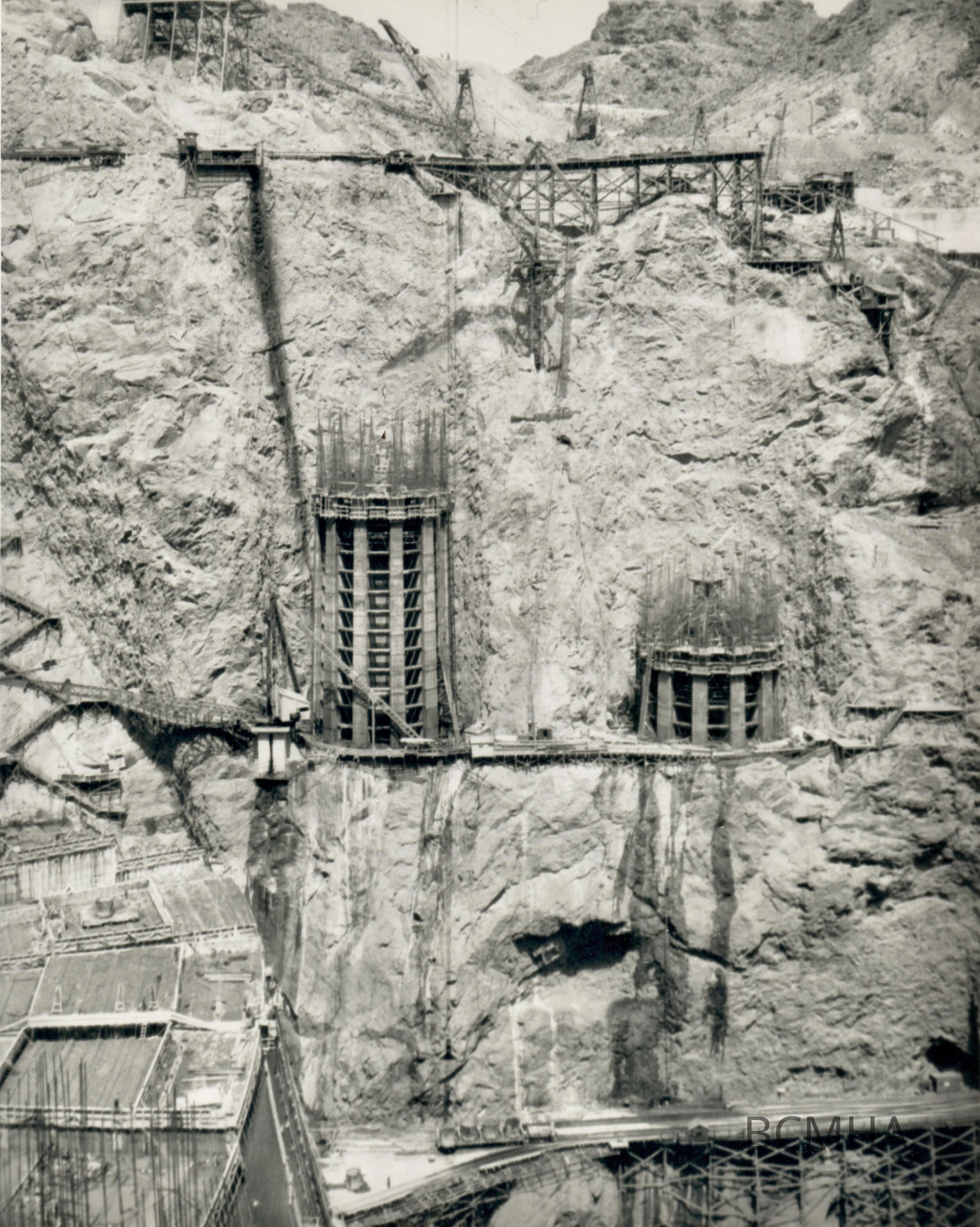 Hoover Dam construction: "View of Nevada intake towers from the Arizona side." 4-28-34; W. A. Bechtel Collection Photo #2649 - Volume Three; Roll 36 - Photo No. 4 Copy Negative - Bureau of ReclamationCollection