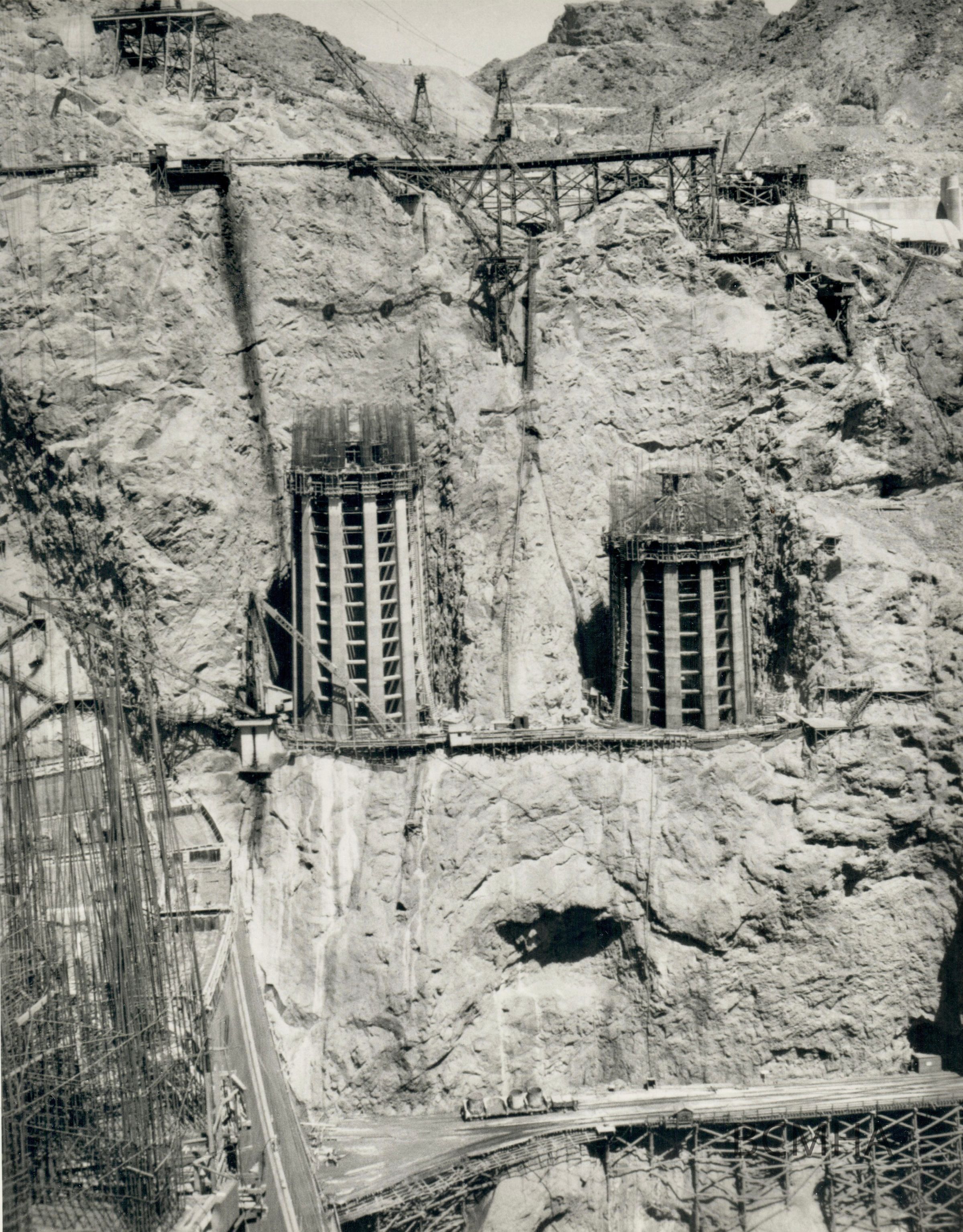 Hoover Dam - construction: "Nevada intake towers from the Arizona side." 5-29-34; W. A. Bechtel Collection Photo #2709 - Volume Three; Roll 36 - Photo No. 10 Copy Negative - Bureau of ReclamationCollection