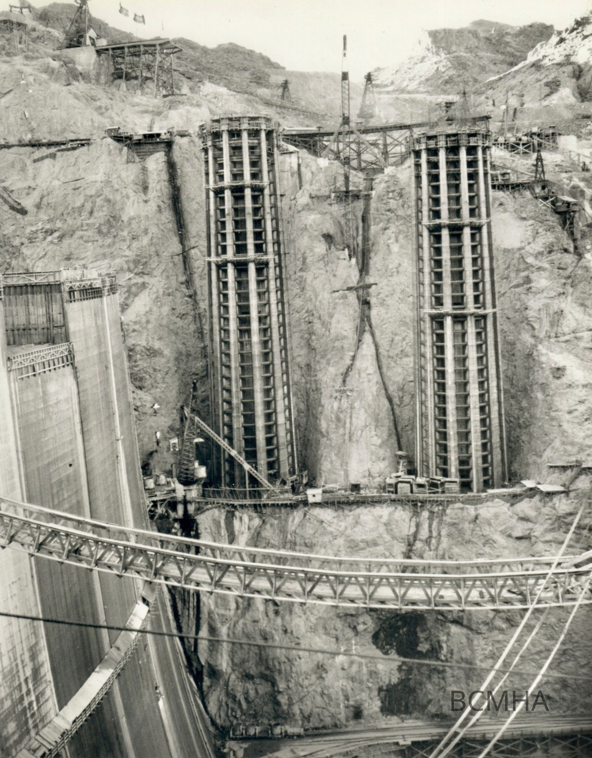 Hoover Dam construction: "Nevada intake towers from the Arizona side." 10-25-34; W. A. Bechtel Collection Photo #2895 - Volume Three; Roll 38 - Photo No. 10 Copy Negative - Bureau of ReclamationCollection