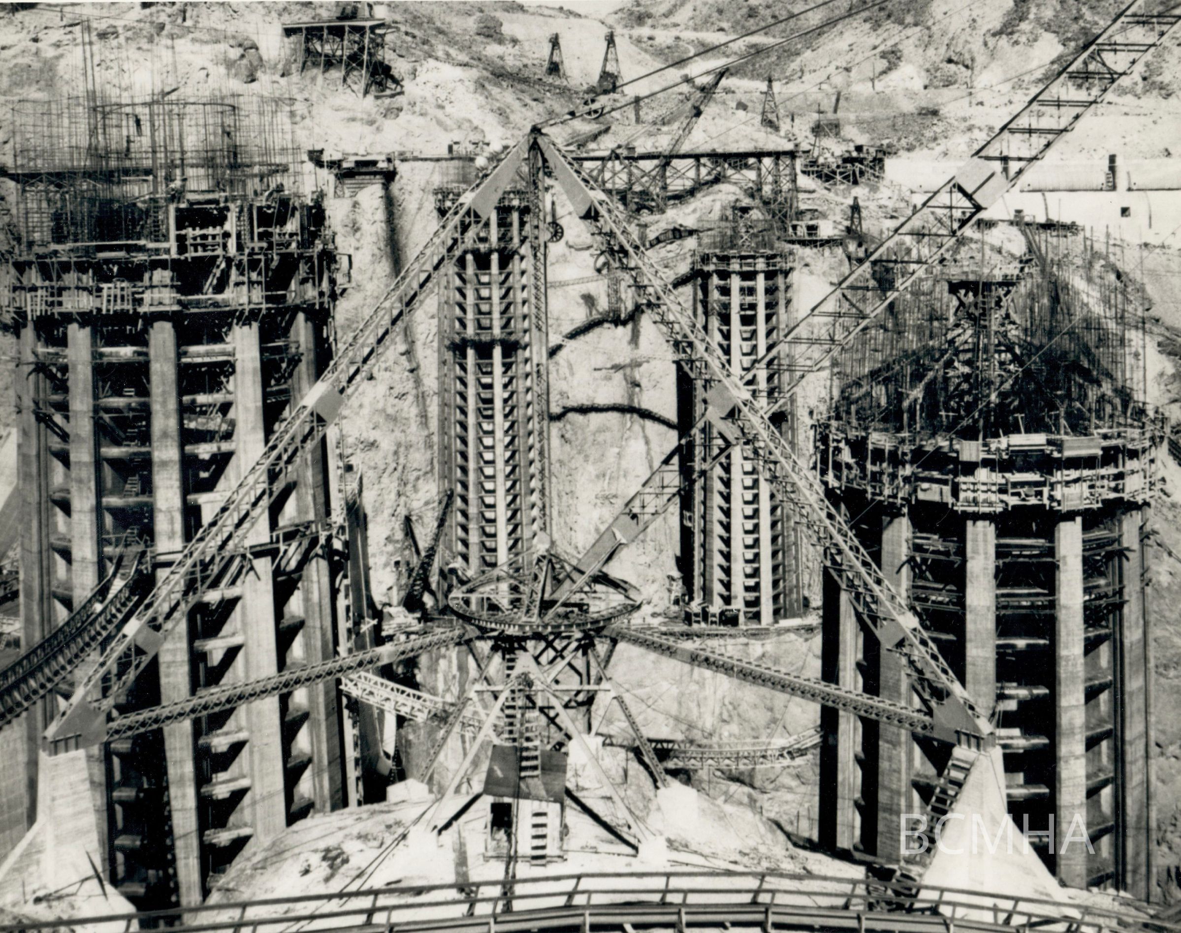 Hoover Dam construction: "Looking from the Arizona side toward the Nevada side, showing all four intake towers, three derricks, Boulder Dam to the left, and the Nevada spillway to the right." 9-27-34; W. A. Bechtel Collection Photo #2865 - Volume Three; Roll 38 - Photo No. 8 Copy Negative - Bureau of ReclamationCollection