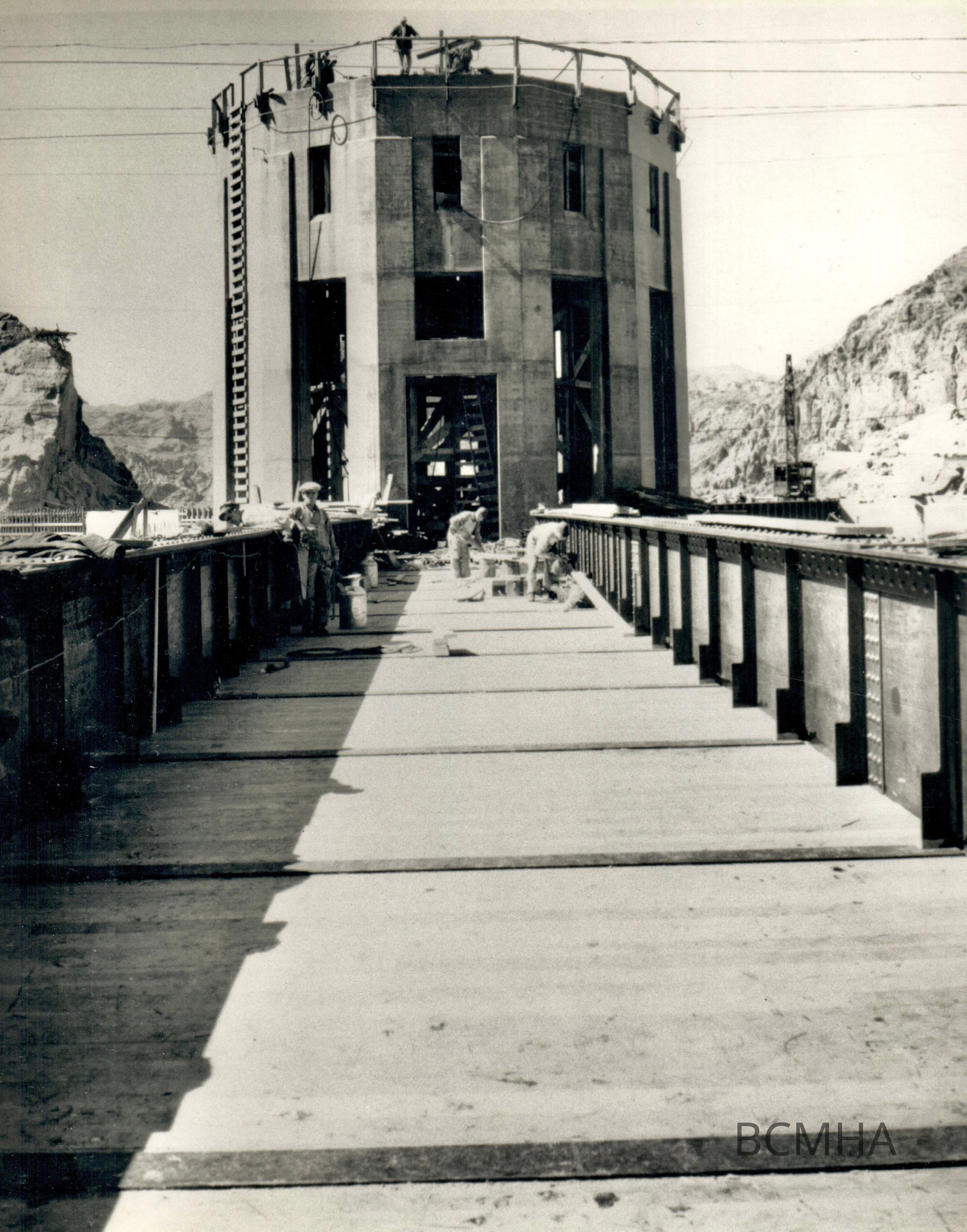 Hoover Dam - construction: "Looking downstream toward No. 6 Arizona intake tower control house. Note the bridge forms being placed for pouring." 3-25-35; W. A. Bechtel Collection Photo #3160 - Volume Three; Roll 41 - Photo No. 10 Copy Negative - Bureau of ReclamationCollection