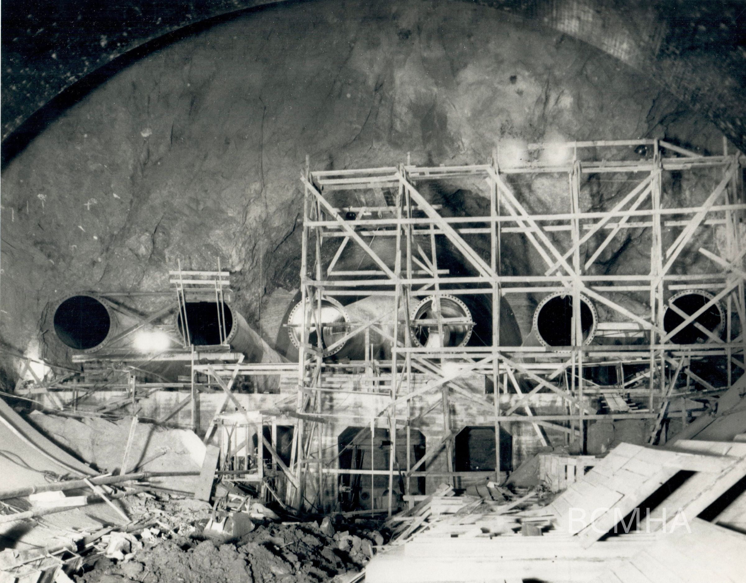 Hoover Dam - construction: "Looking upstream in lower No. 2 downstream plug showing the water conduit being placed." 10-28-35; W. A. Bechtel Collection Photo #3501 - Volume Three; Roll 45 - Photo No. 8 Copy Negative - Bureau of ReclamationCollection