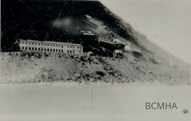 Hoover Dam construction: River Camp, 1931; Six Companies Dormitory upstream from Dam; Sign "Safety First"; Altus "Tex" and Dorothy NunleyCollection
