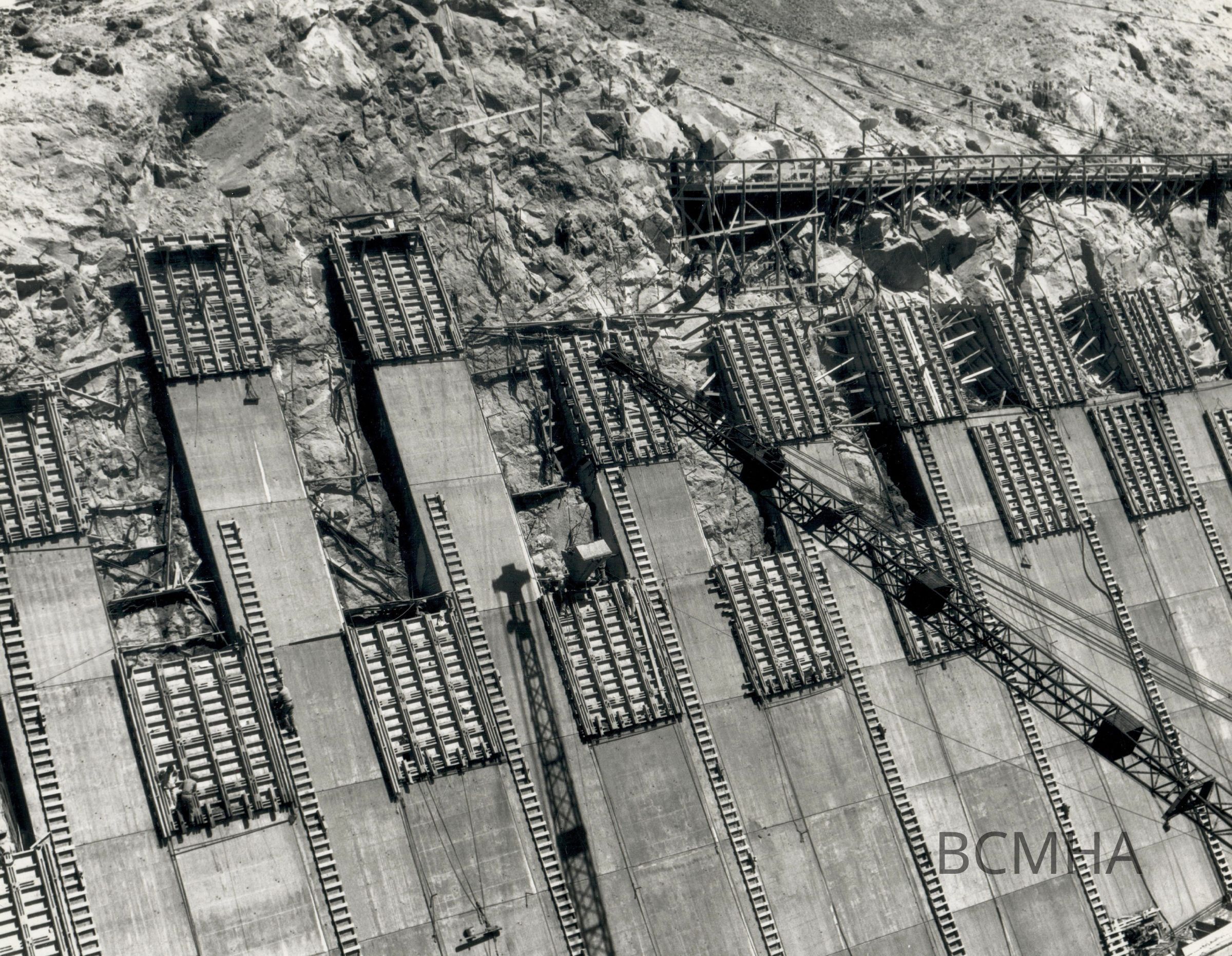 Hoover Dam construction: "Photo shows placing concrete in sidewall forms of Nevada spillway. Concrete is being handled by crane in 2 cu. yd. bottom bucket supplied from truck mounted agitators operated from high level concrete mixing plant." June 10, 1933; Water and Power Resources Service photo; W. R. West, photographer; USBR photo/P45-301-1759 NACollection