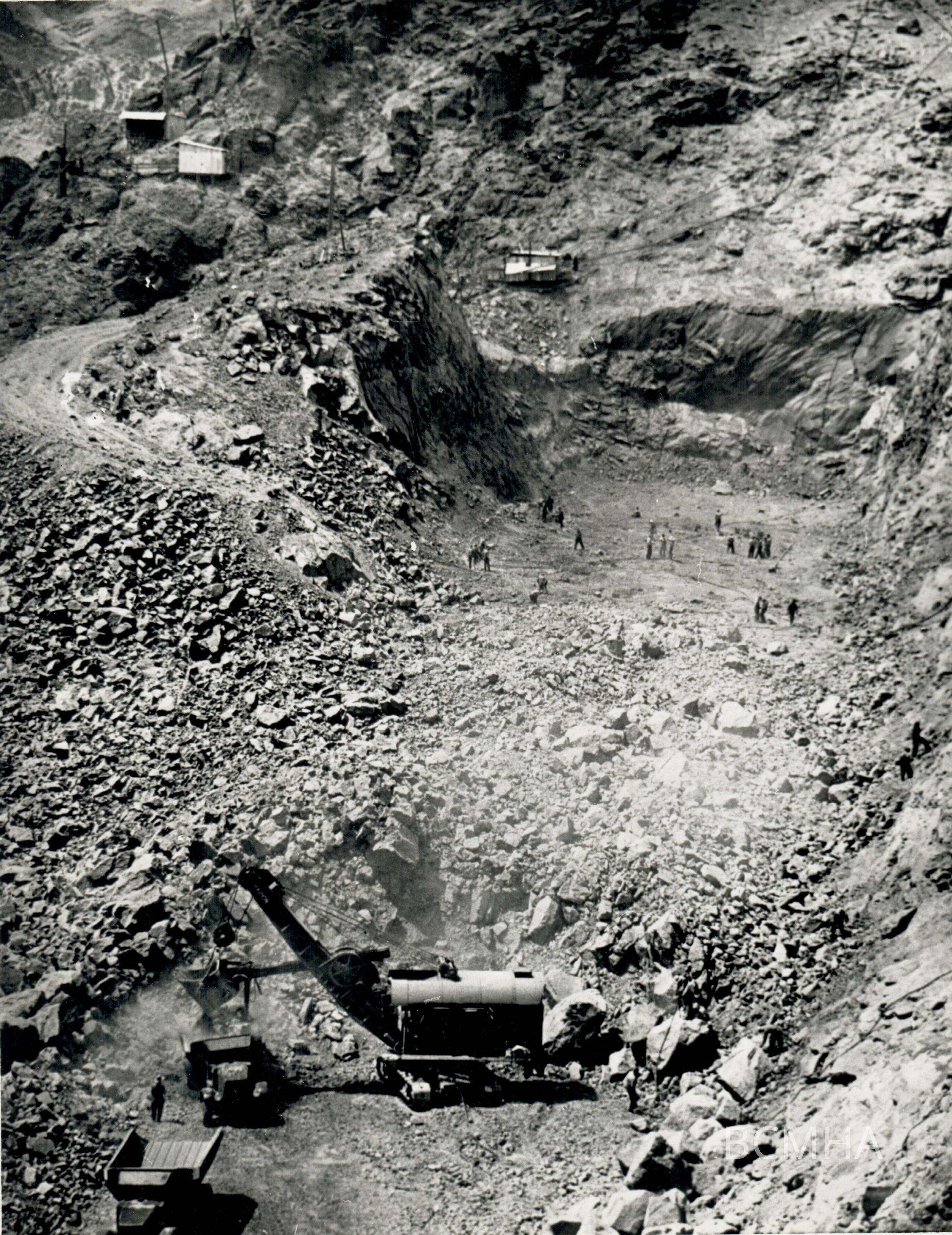 Hoover Dam construction: spillways Nevada: "Looking downstream into excavation for Nevada spillway structure. Flat face of cut at far end of excavation marks the approximate point of inlet to inclined spillway tunnel." 5/3/32; B. D. Glaha, photographer; USBR photo/BCP 1183A; UNLV Library - Special Collections Copy NegativeCollection