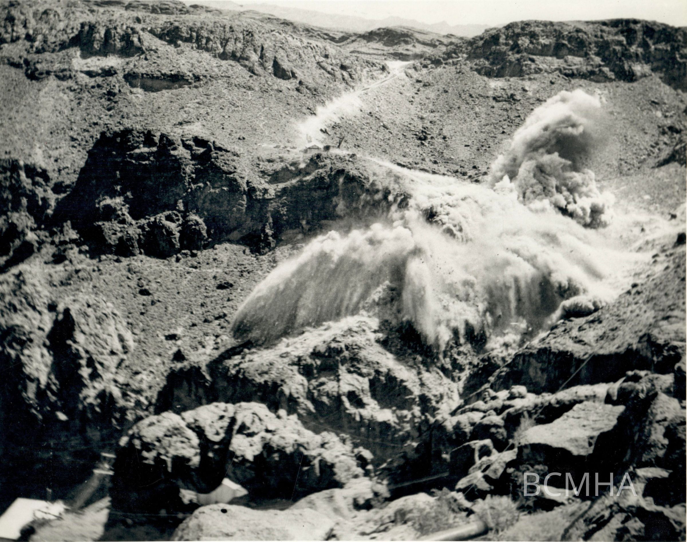 Hoover Dam - construction: spillways, Arizona: "The first blast on the Arizona spillway opencut excavation. Sixteen tons of powder were used. Compare the blast with the building shown in the picture." 4-4-32.; W. A. Bechtel Collection Photo #1081 - Volume Two; Roll 17 - Photo No. 10 Copy Negative - Bureau of ReclamationCollection