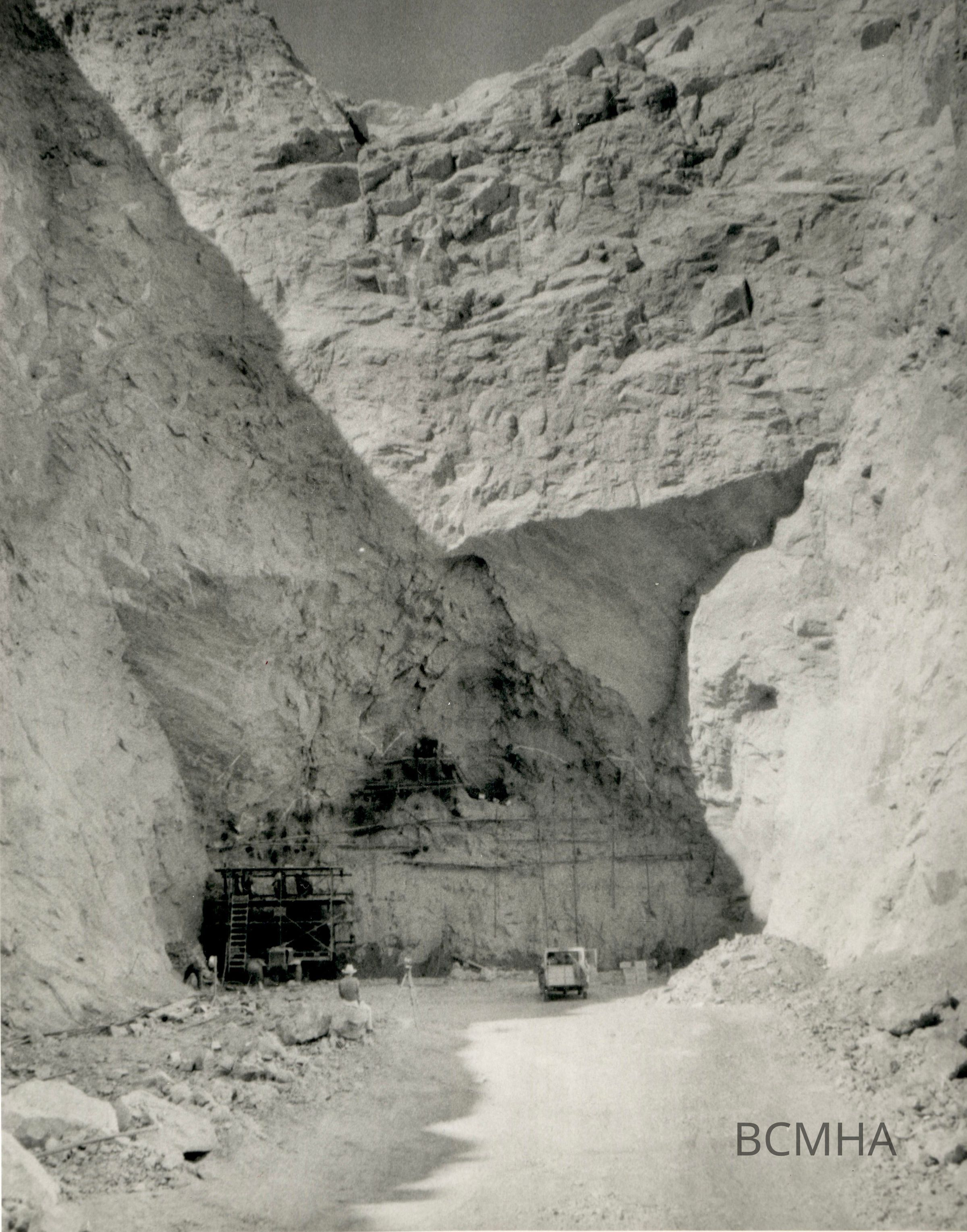 Hoover Dam construction: spillways, Arizona: "Close-up of portal of Arizona inclined spillway tunnel leading down into Diversion Tunnel No. 4." 8-29-32; W. A. Bechtel Collection Photo #1518 - Volume Two; Roll 26 - Photo No. 4 Copy Negative - Bureau of ReclamationCollection