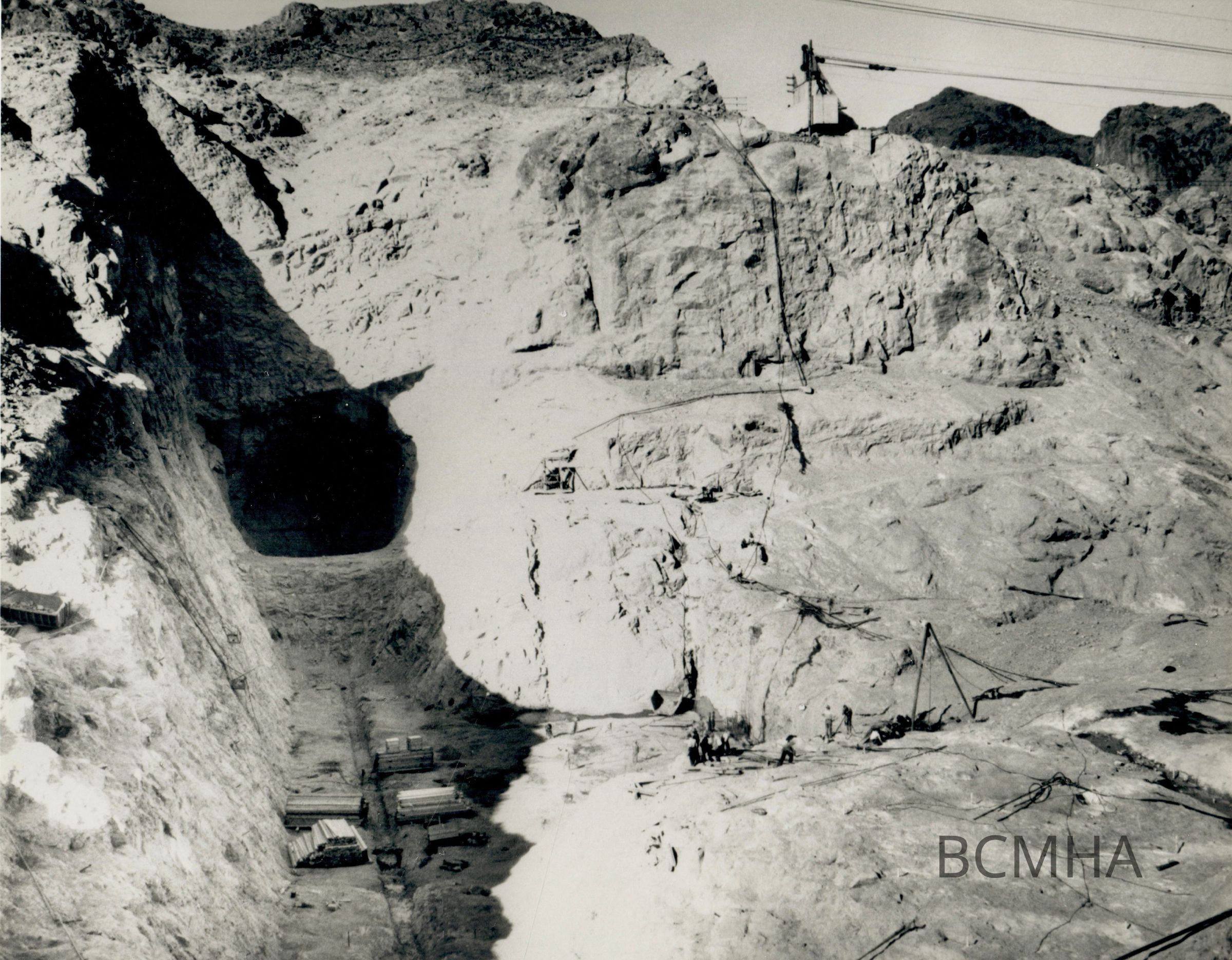 Hoover Dam - construction: spillways, Arizona: "Looking downstream into the opencut of the Arizona spillway." 4-21-33; W. A. Bechtel Collection Photo #2076 - Volume Three; Roll 31 - Photo No. 3 Copy Negative - Bureau of ReclamationCollection