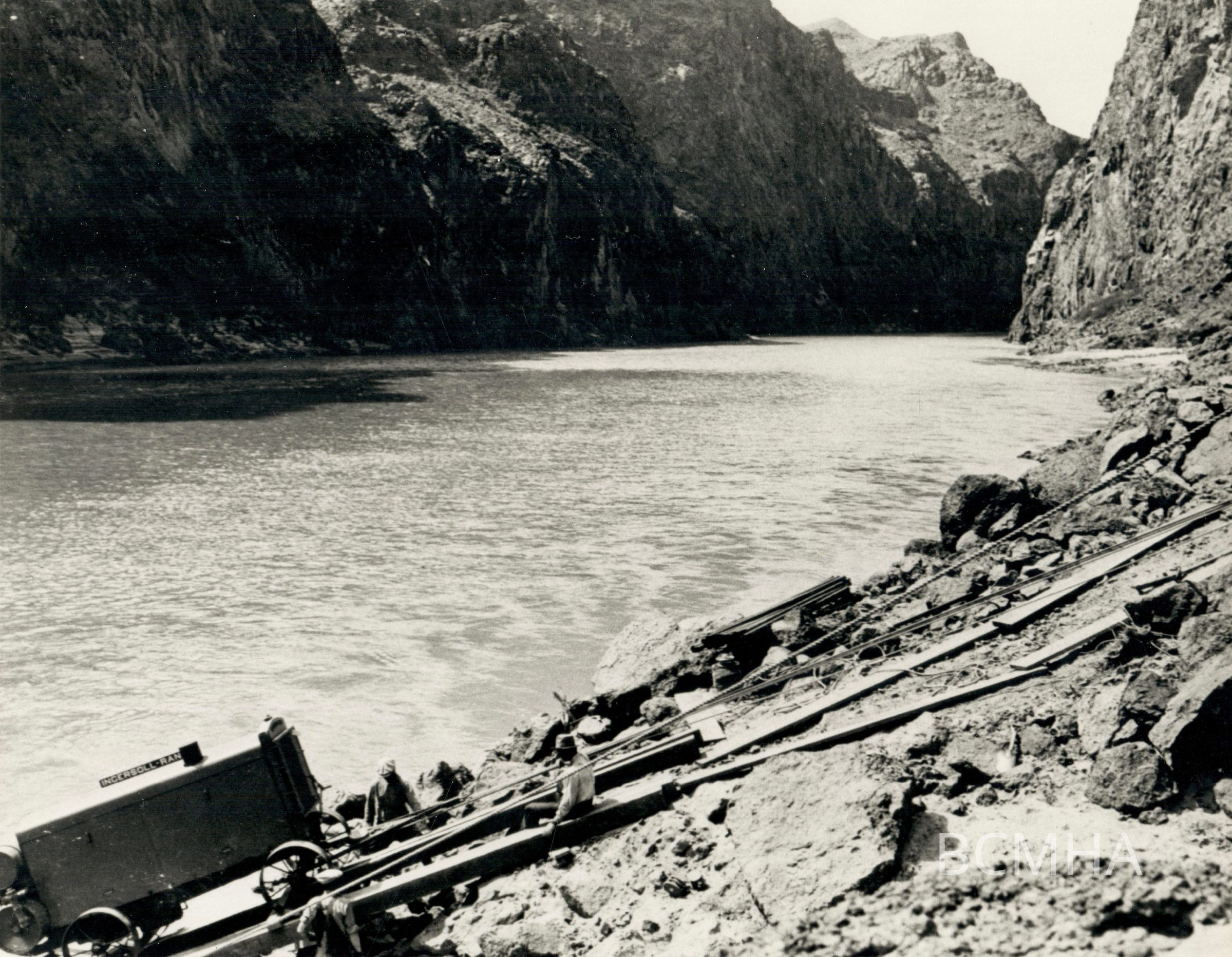 Hoover Dam construction: "Graphic Views of Hoover Dam Portable air compressors being pulled by block and tackle up the side of the canyon (looking downstream at entrance to Black Canyon). Circa Early 1931."; W. A. Davis Collection Photo #48 by W. A. Davis; Roll 10 - Photo No. 4 Copy Negative - Bureau of ReclamationCollection