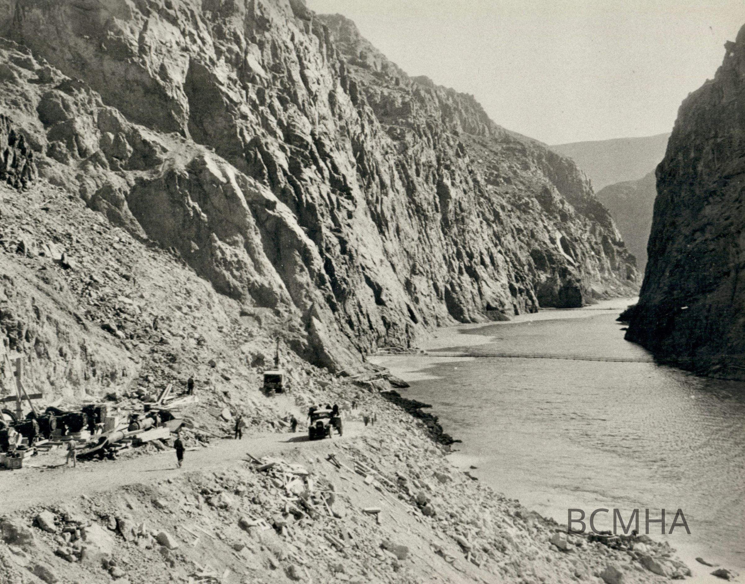 Hoover Dam construction: "Graphic Views of Hoover Dam Looking upstream on the Nevada side where a start is being made on the lower portal of one of the diversion tunnels. Circa Early 1931."; This would be tunnel No.1-NV. outer-or tunnel No.2-NV. inner.; W. A. Davis Collection Photo #57 by W. A. Davis; Roll 10 - Photo No. 7 Copy Negative - Bureau of ReclamationCollection