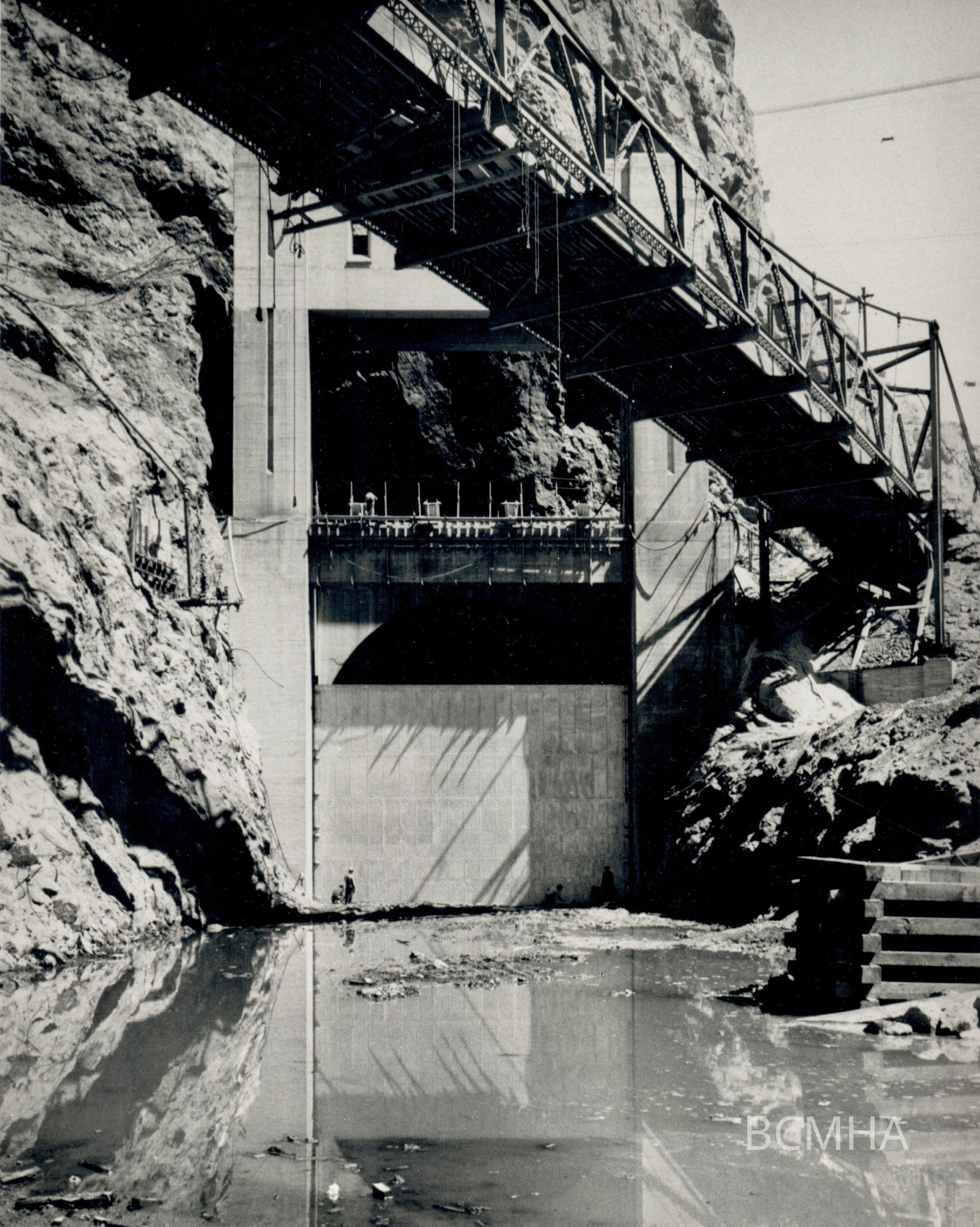 Hoover Dam construction: "Final test of 50' x 35' Stoney gate at the lower portal of Diversion Tunnel No. 2." 4-22-33; W. A. Bechtel Collection Photo #2170 - Volume Two; Roll 29 - Photo No. 10 Copy Negative - Bureau of ReclamationCollection