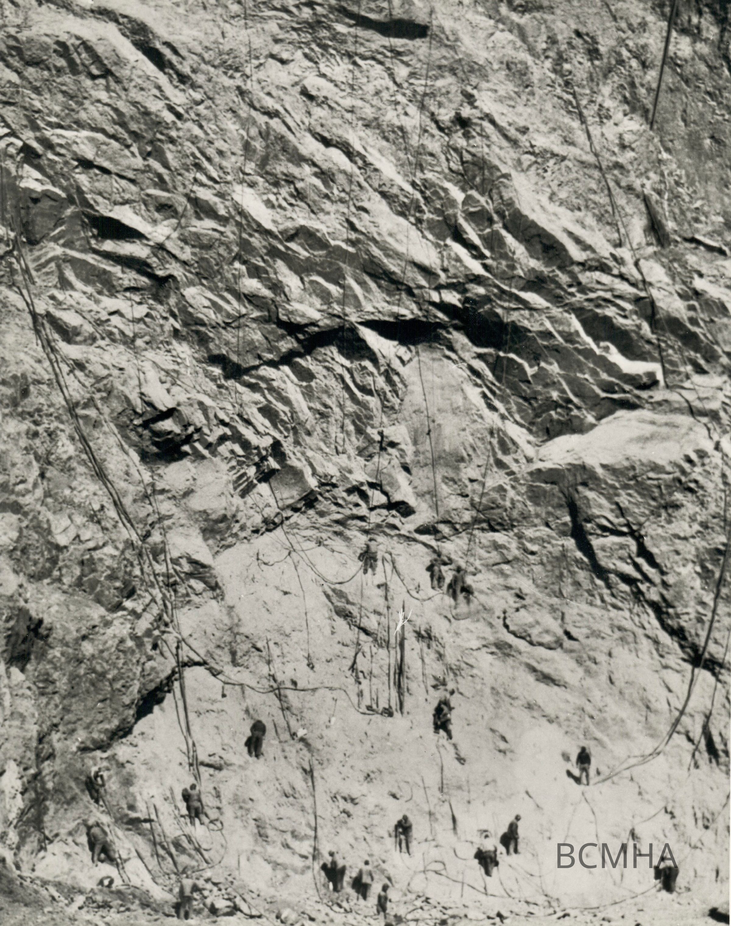 Hoover Dam construction: workers "Jackhammer" drill crew at work in open cut at outlet of Nevada spillway tunnel. Note safety ropes and helmets."; 12/1/30; USBR photo/BCP 963A; B. D. Glaha, photographer; UNLV Library - Special Collections Copy NegativeCollection