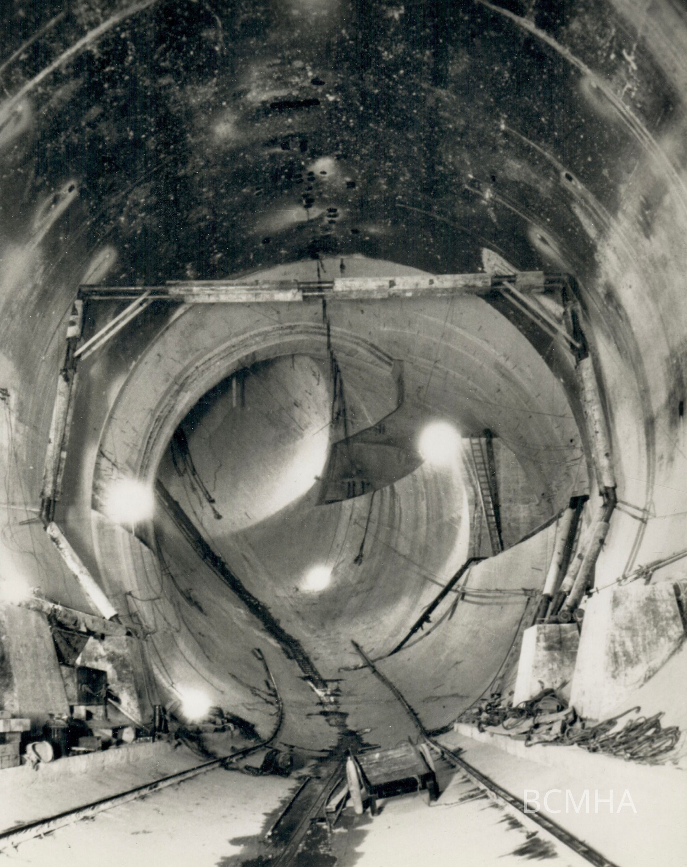 Hoover Dam construction: "Looking upstream into No. 3 plug and raise, showing plug concrete in place, cooling headers above, and rail extension for moving steel pipe.." 11-17-34. [W. A. Bechtel Collection Photo #2935 - Volume Three; Roll 39 - Photo No. 5 Copy Negative - Bureau of ReclamationCollection