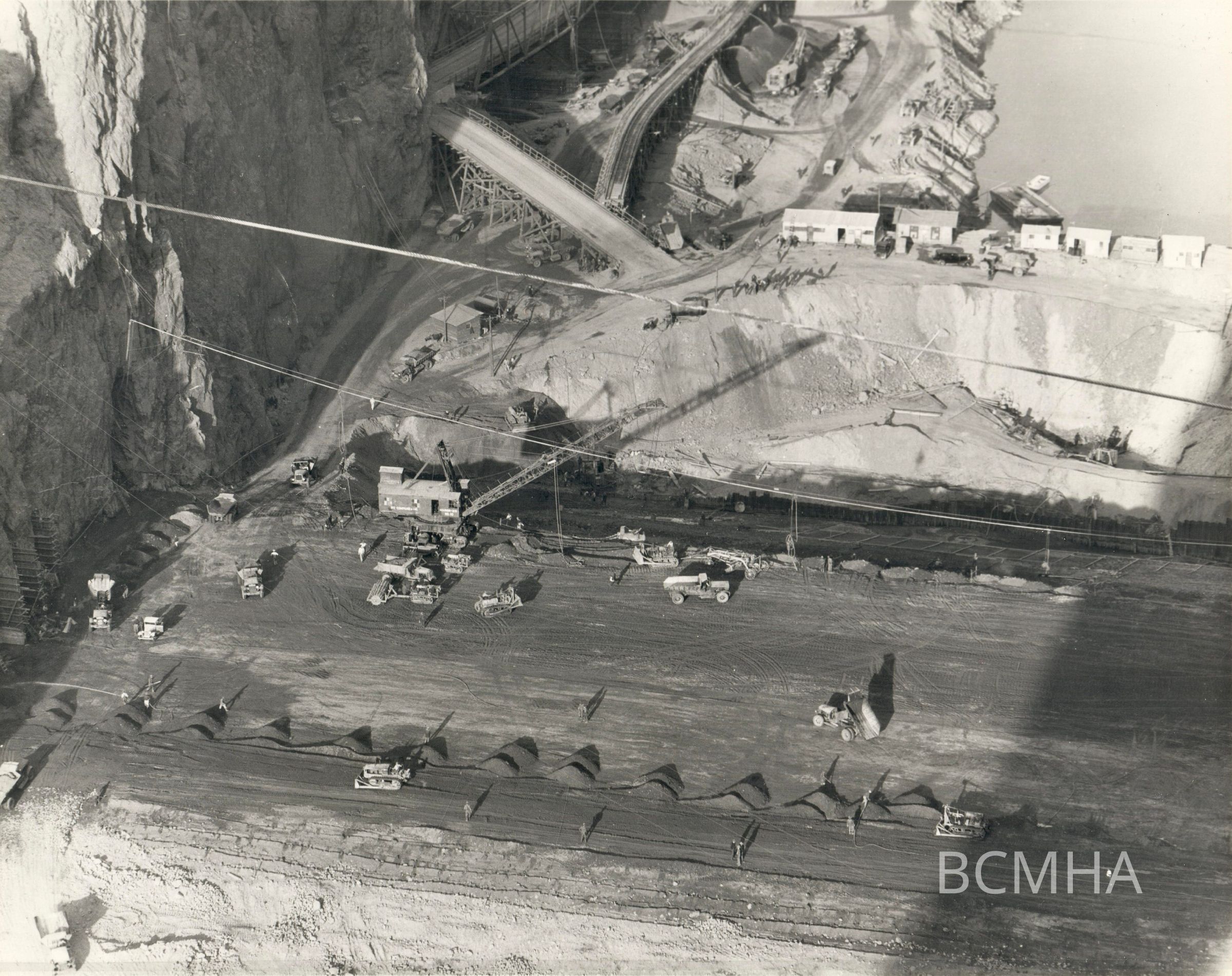 Hoover Dam construction: "Looking down onto the upper cofferdam operations from a point on Arizona abutment. Fill is approaching maximum elevation 720. Photo also shows construction installations at Nevada diversion tunnel portals." 12-26-32; B. D. Glaha, photographer; USBR photo/BCP 1482Collection