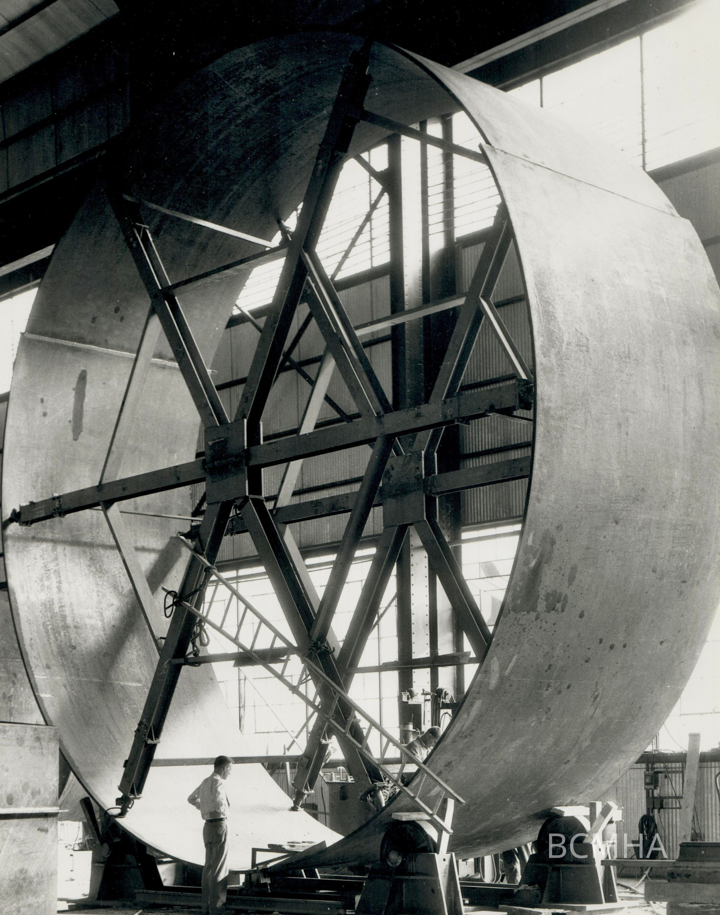 Hoover Dam construction: penstocks: "Photo shows 30' diameter penstock pipe assembled for longitudinal seams. Babcock and Wilcox Co. Plant." October 23, 1933; Water and Power Resources Service photo; B. D. Glaha, photographer; USBR photo P45-301-2116Collection