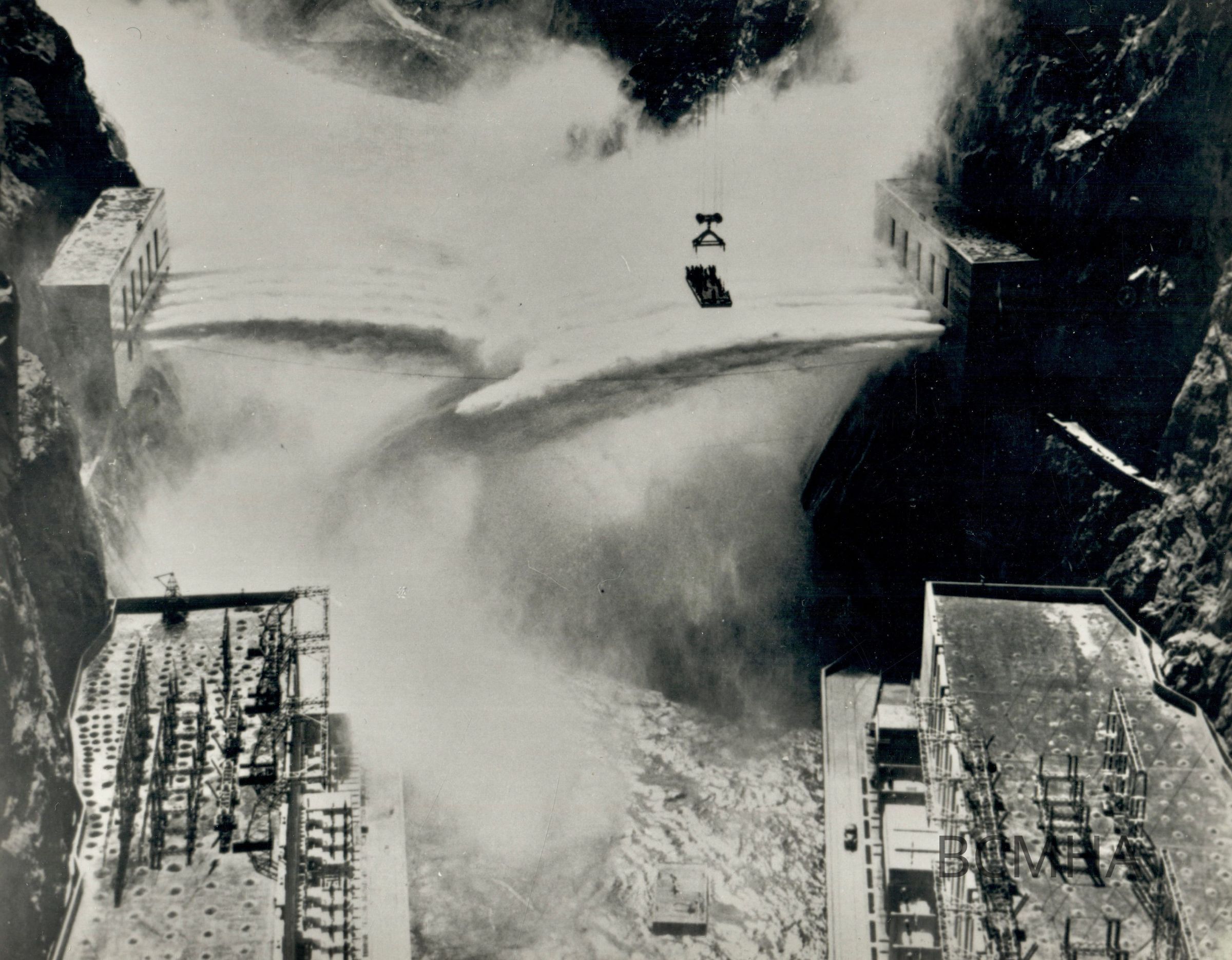 Hoover Dam construction: canyon wall outlet works in operation, September 28, 1940 "Looking downstream from the crest of Boulder Dam showing water flowing from the canyon wall outlet valves. Radio, newspaper, and newsreel men are being lowered on the skip by the government cableway for a close-up view." 9/28/40; Cliff Segerblom, photographer; USBR photo/ BCP 05123; UNLV Library - Special Collections Copy NegativeCollection