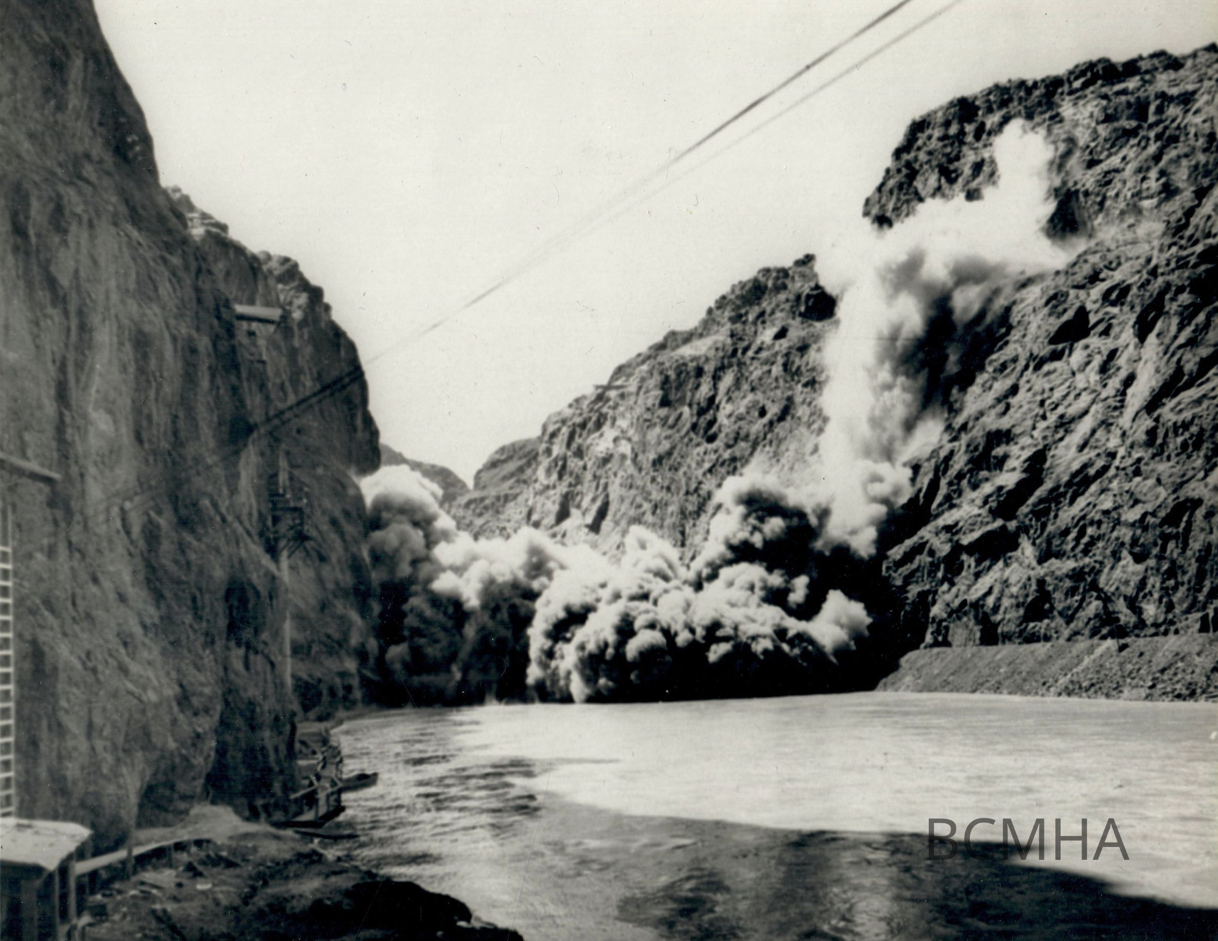 Hoover Dam construction: "View taken a few minutes after photo No. 1046 (a blast in scaling down the canyon walls for the construction of the intake towers)." 3-28-32; W. A. Bechtel Collection Photo #1047 - Volume Two; Roll 17 - Photo No. 8 Copy Negative - Bureau of ReclamationCollection