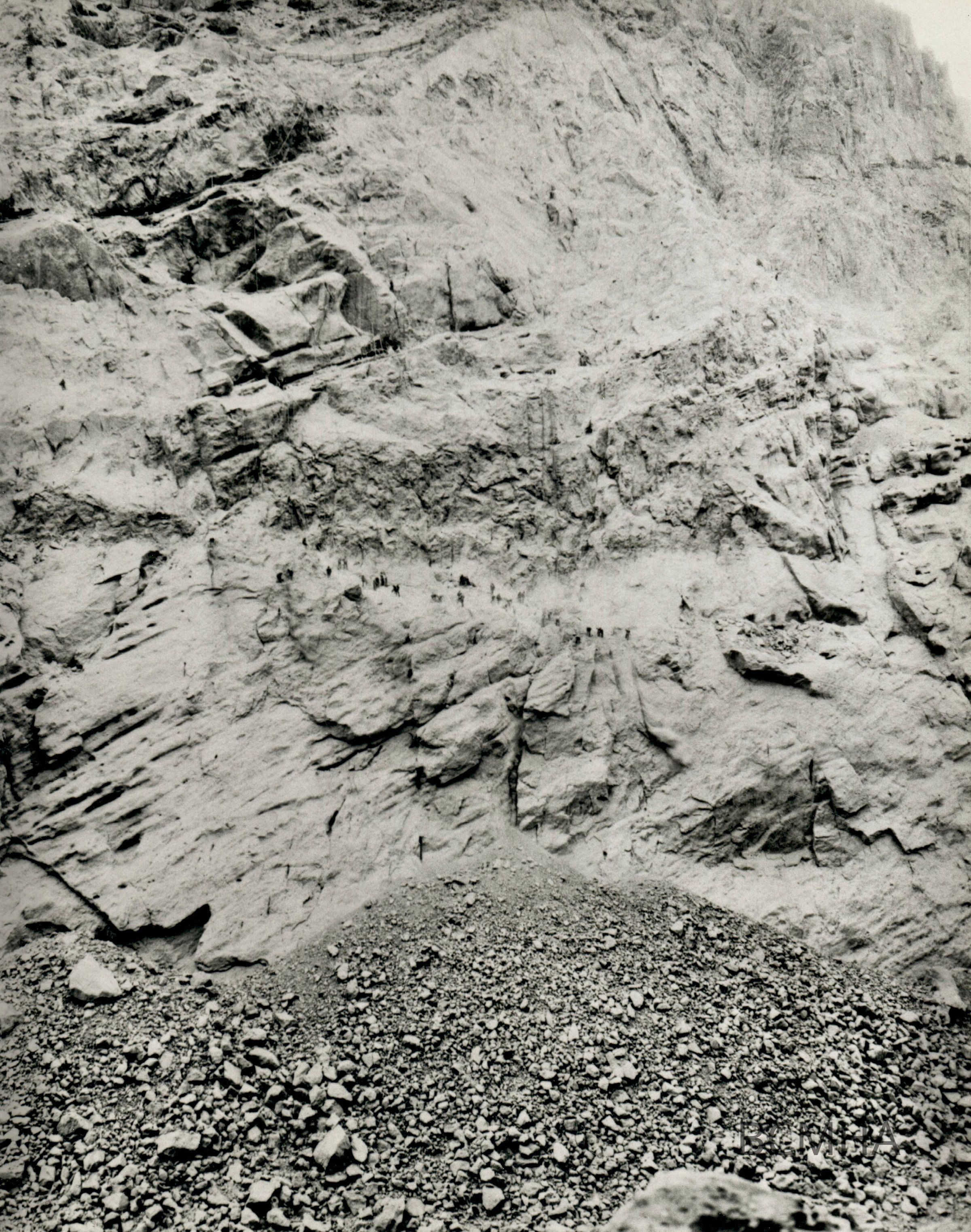 Hoover Dam construction: "High-scaling activities on the Arizona side in connection with excavation of Arizona valve house and construction adit portal." 12-21-32; W. A. Bechtel Collection Photo #1830 - Volume Two; Roll 28 - Photo No. 5 Copy Negative - Bureau of ReclamationCollection