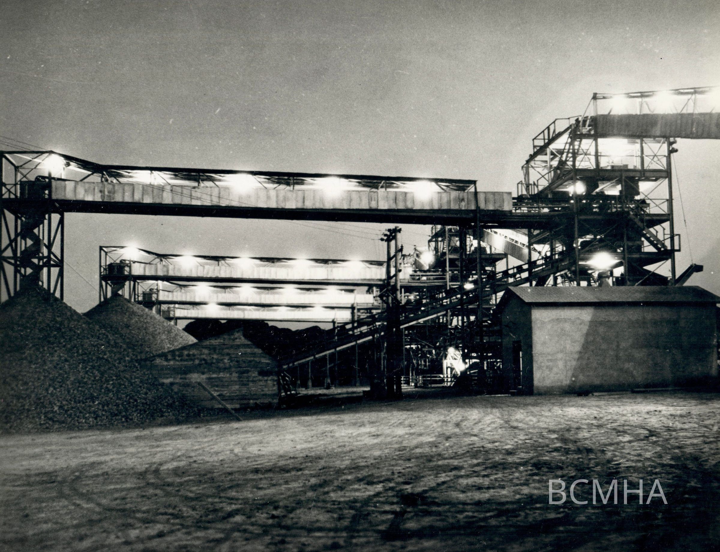 Hoover Dam construction: concrete: "A night view of the gravel plant taken near the first scalping screen and looking in the opposite direction than the view on the left. 2-26-32; Bechtel No.94; W. A. Bechtel Collection Photo #937 - Volume Two; Roll 16 - Photo No. 4; Copy Negative - Bureau of ReclamationCollection