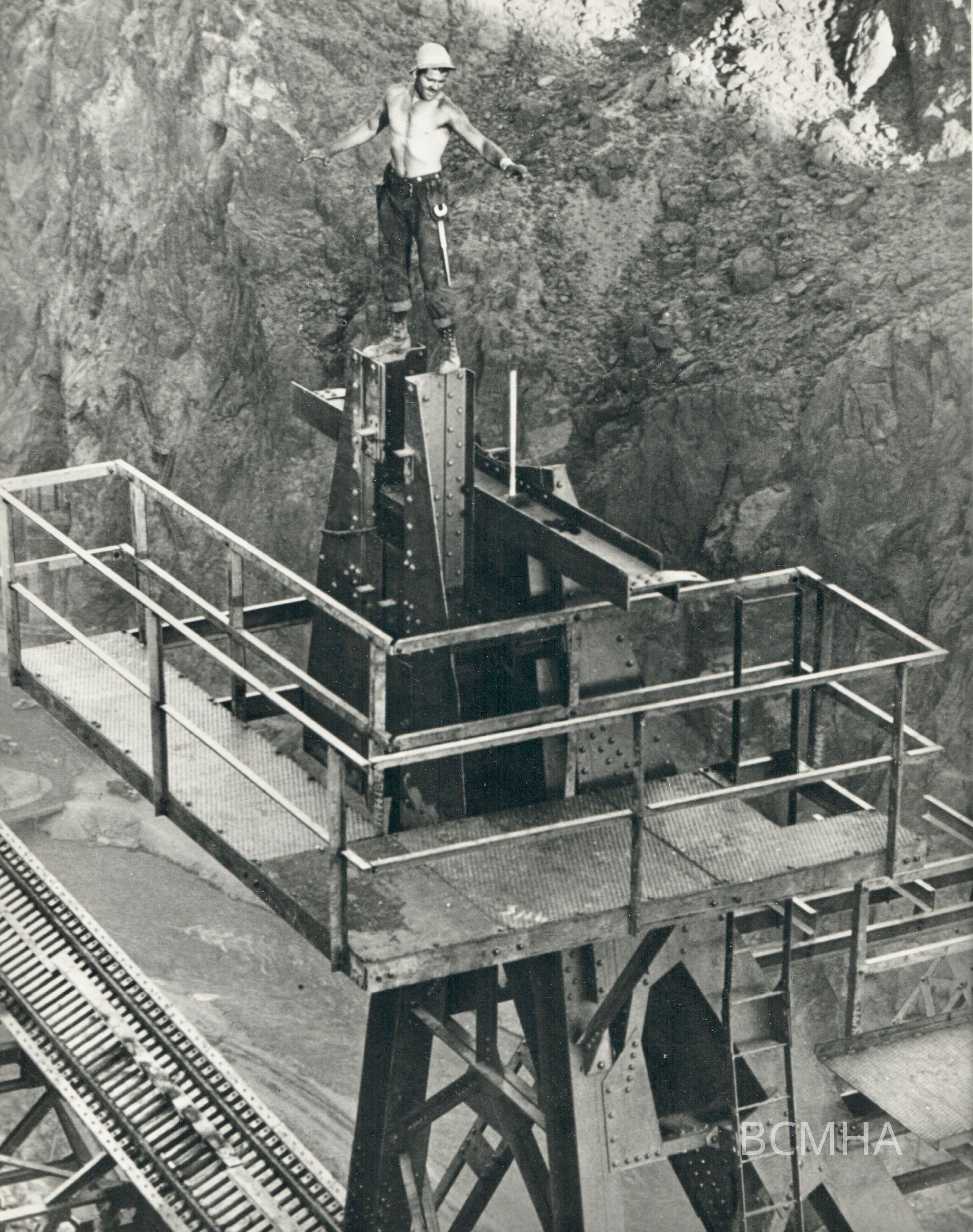 Hoover Dam construction: cableways, c. 1932 "rigger" Louis Paul Issoglio is balanced on the cableway head tower during construction."; Photo appeared in the September 1933 issue of Fortune Magazine, p. 76; Outside Collection of Harold Ickes No.7 Collections of the Library of Congress; Bureau of Reclamation; Ben D. Glaha, photographer; neg at 0007:0673Collection