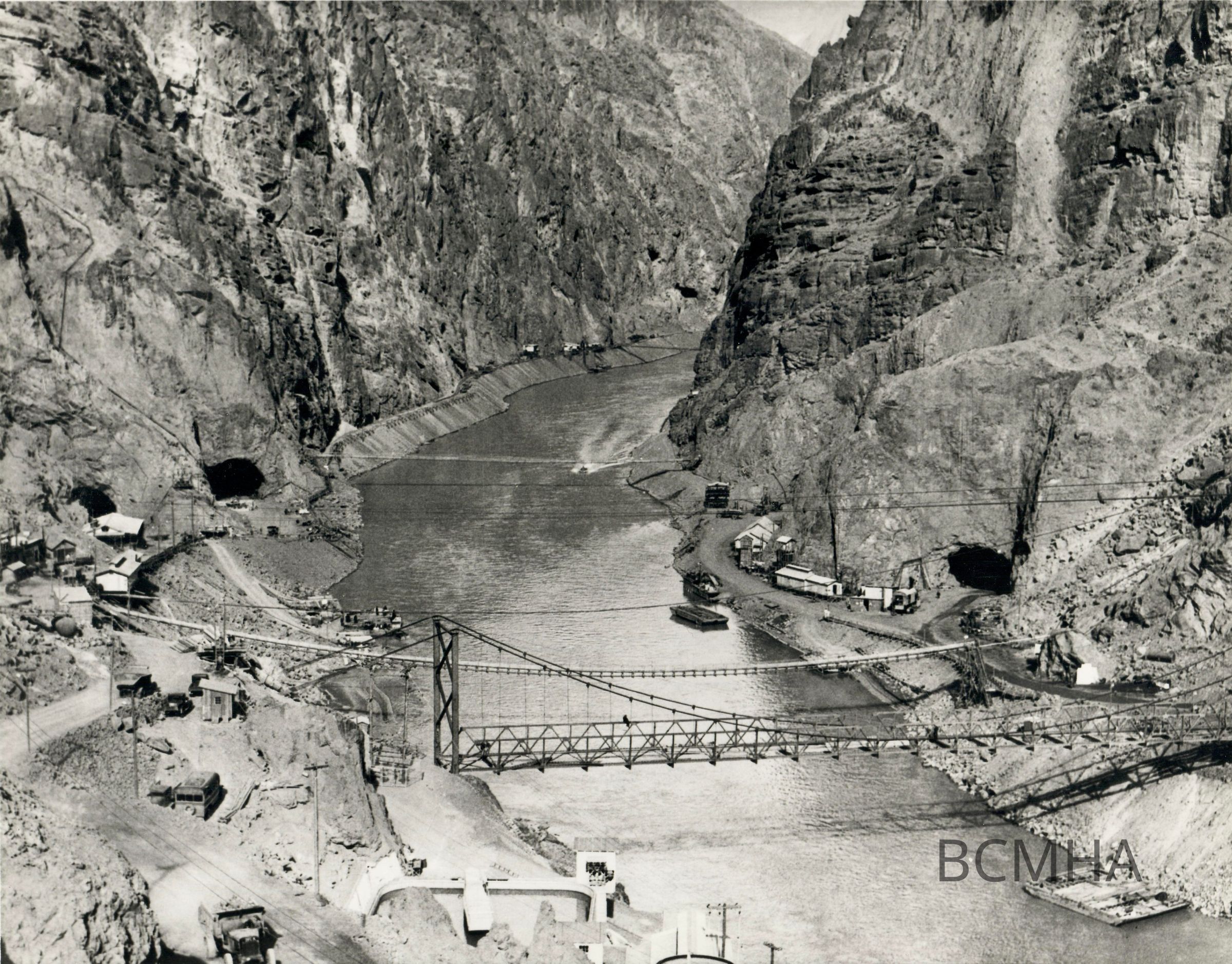 Hoover Dam construction: Black Canyon damsite: "General view, looking upstream, of Black Canyon showing operations at tunnel outlet portals. In the foreground is seen the steel suspension bridge being erected by Six Companies, Inc., and the pre-sedimentation tank of the Boulder City water supply. View was taken from point above Hairpin Curve on Six Companies Inc., Construction road." 2-1-32; BCP 01009 A; Bureau of Reclamation photo by B. D. GlahaCollection