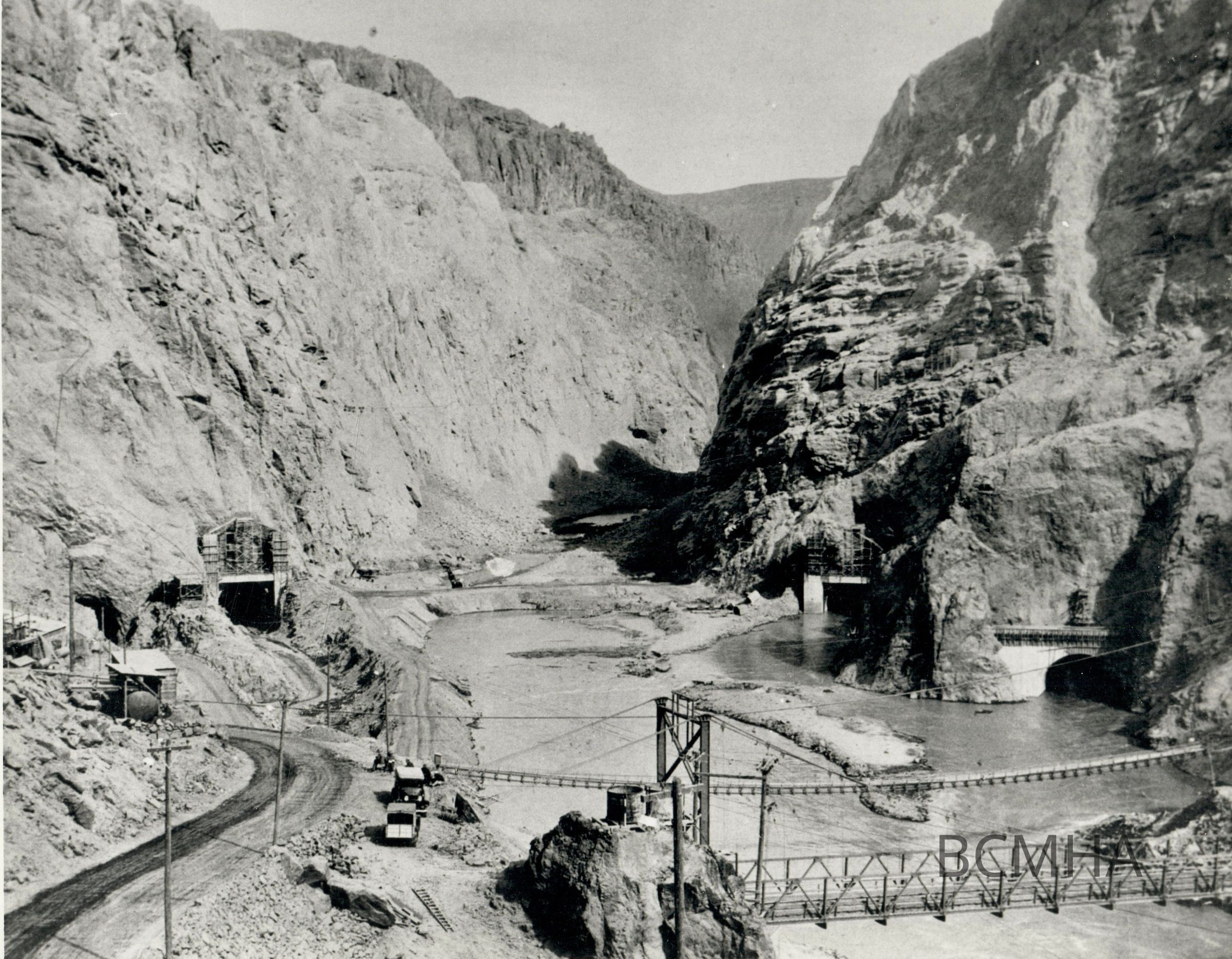 Hoover Dam construction: Black Canyon damsite: "Looking upstream into Black Canyon toward Hoover Dam site, showing outlet portals of four diversion tunnels and blasting in outlet valvehouse at excavations." 12-31-32; Photo by B. D. Glaha; USBR/Wash. No. 01500Collection