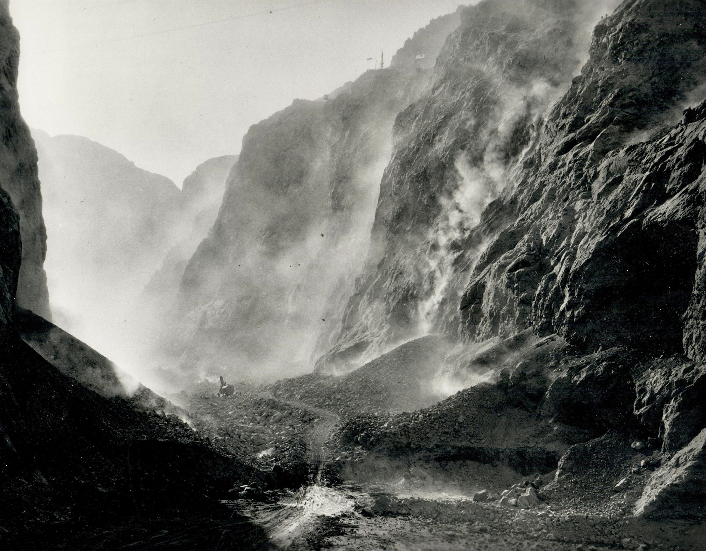 Hoover Dam construction: blasting: "Looking downstream toward Boulder damsite from lower slope of upper cofferdam. Base of Nevada intake towers excavation seen in upper right. December 31, 1932; #LA 327 B6 L3 - UNLV Library Special Collections No. 5; USBR photoCollection