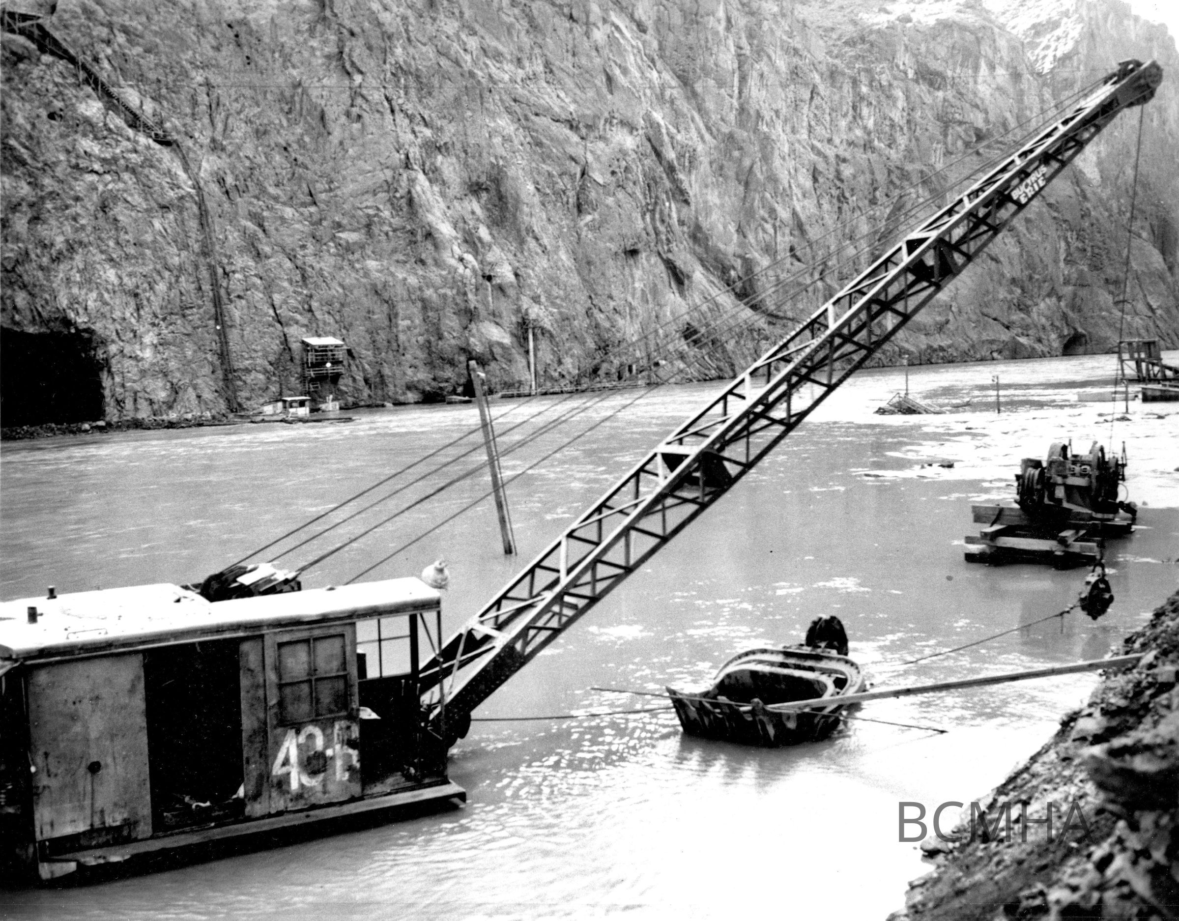 Hoover Dam construction: Colorado River flood, February 10, 1932; "Bucyrus Erie 43-B gas-air shovel was the only piece of equipment caught by the flood,"; BCL - William A. Bechtel album 2, photo no. 896; Roll 15 - Photo no. 4; Copy Negative - Bureau of ReclamationCollection