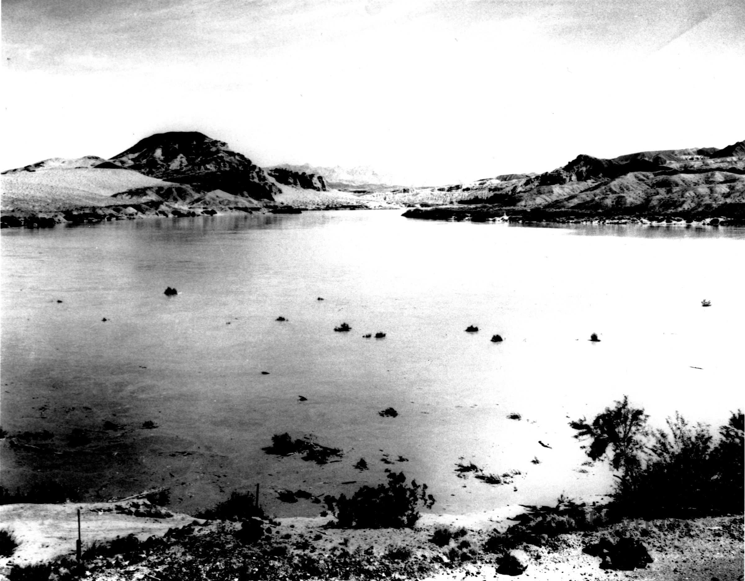Hoover Dam construction: Colorado River flood, May 20, 1932 ["When the river rises it overflows its banks near Williamsville just above the entrance to Black Canyon and assumes the aspect of a lake."; BCL - William A. Bechtel album 2, photo no. 1201; Roll 20 - Photo no. 7; Copy Negative - Bureau of ReclamationCollection