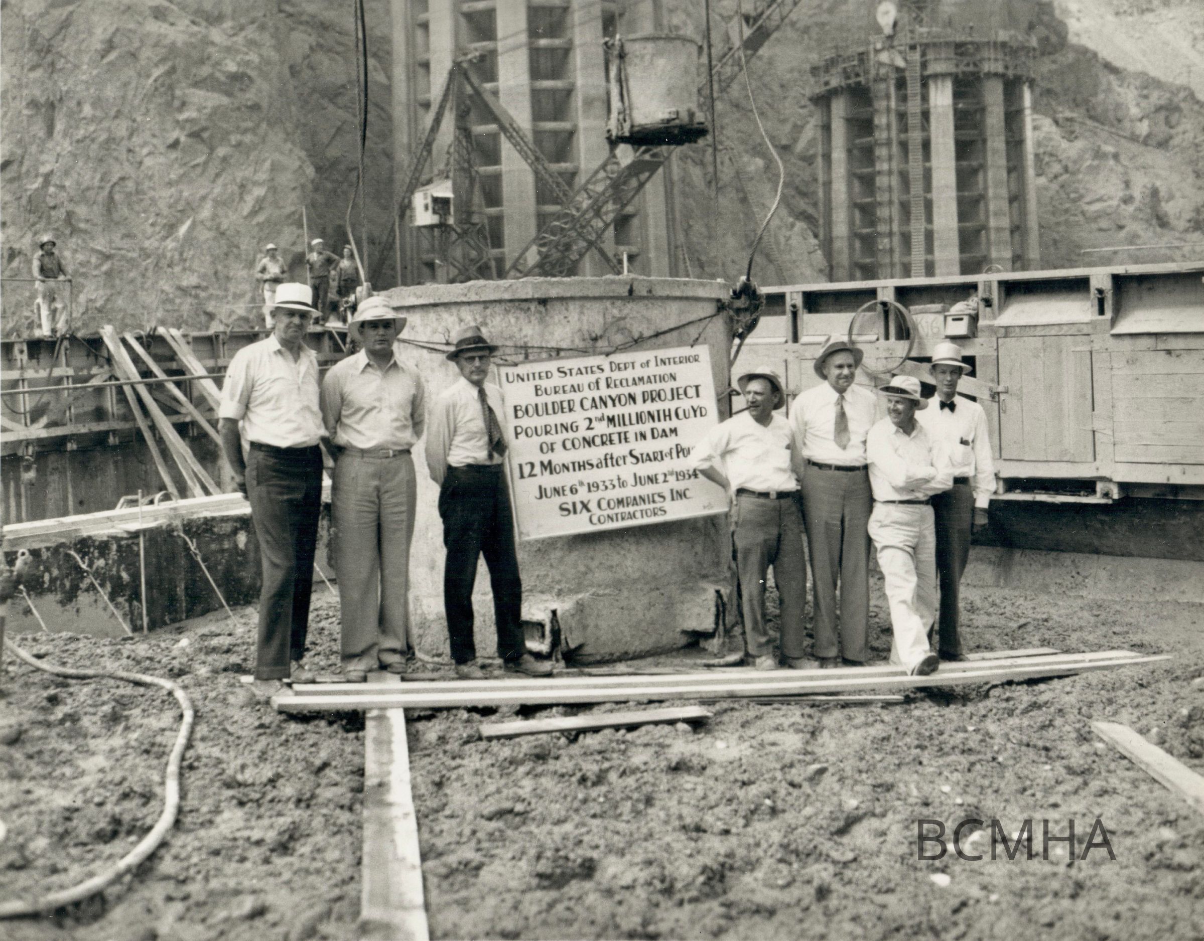 Hoover Dam construction: concrete placement: "Second millionth yard of concrete being placed in Boulder Dam. 6-2-34."; l-r: Frank Crowe; Bernard "Woody" Williams; Walker Young; Charles Shea; unidentified; unidentified; John Page; W. A. Bechtel Collection Photo #2715 - Volume Three; Roll 37 - Photo No. 6 Copy Negative - Bureau of ReclamationCollection