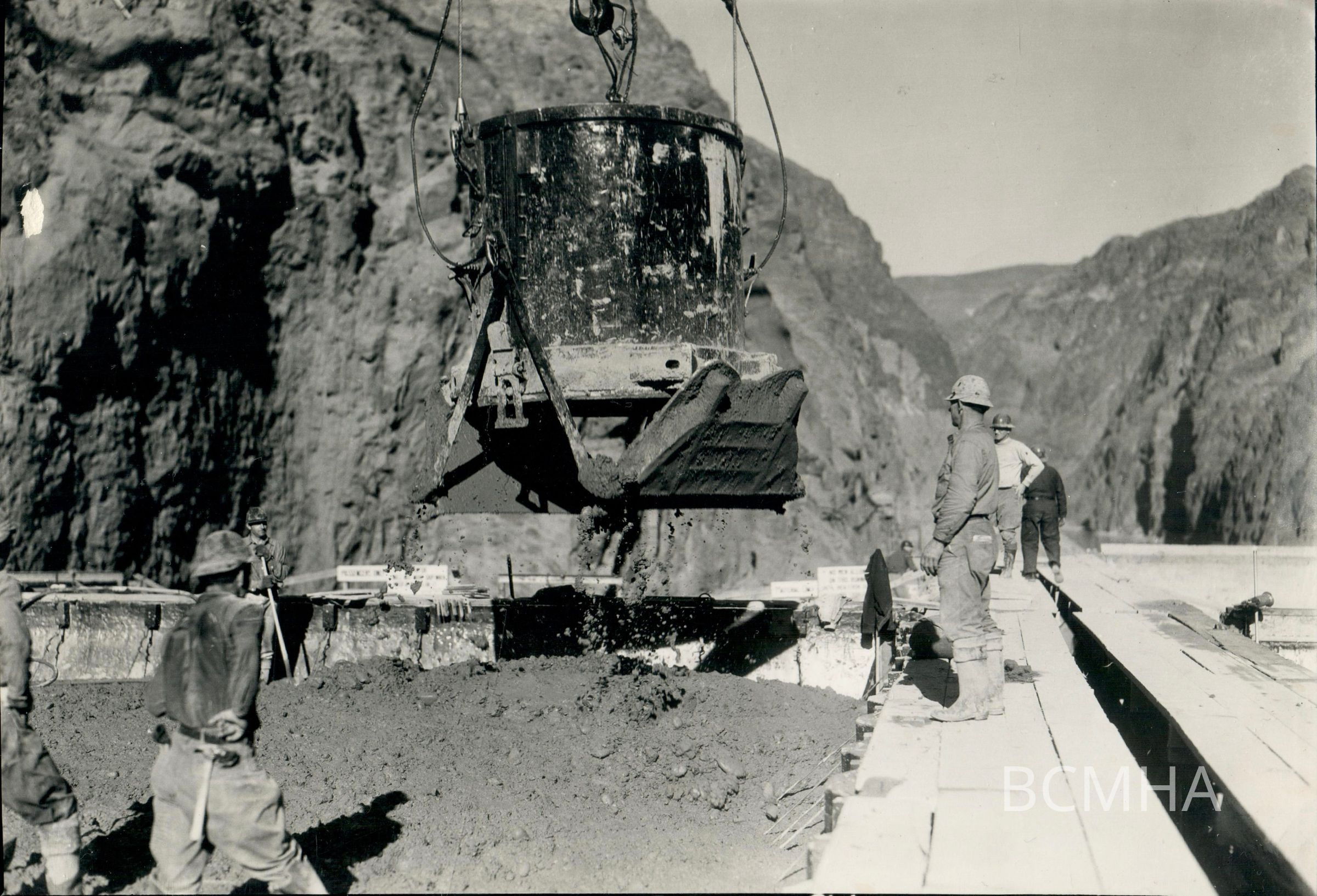 Hoover Dam - construction: concrete placement: "Concrete placement during construction of Hoover Dam, c. 1933."; the man on far right in background, wearing light sweatshirt, and glasses may possibly be Walker R. Young, Boulder Canyon Project construction engineerCollection