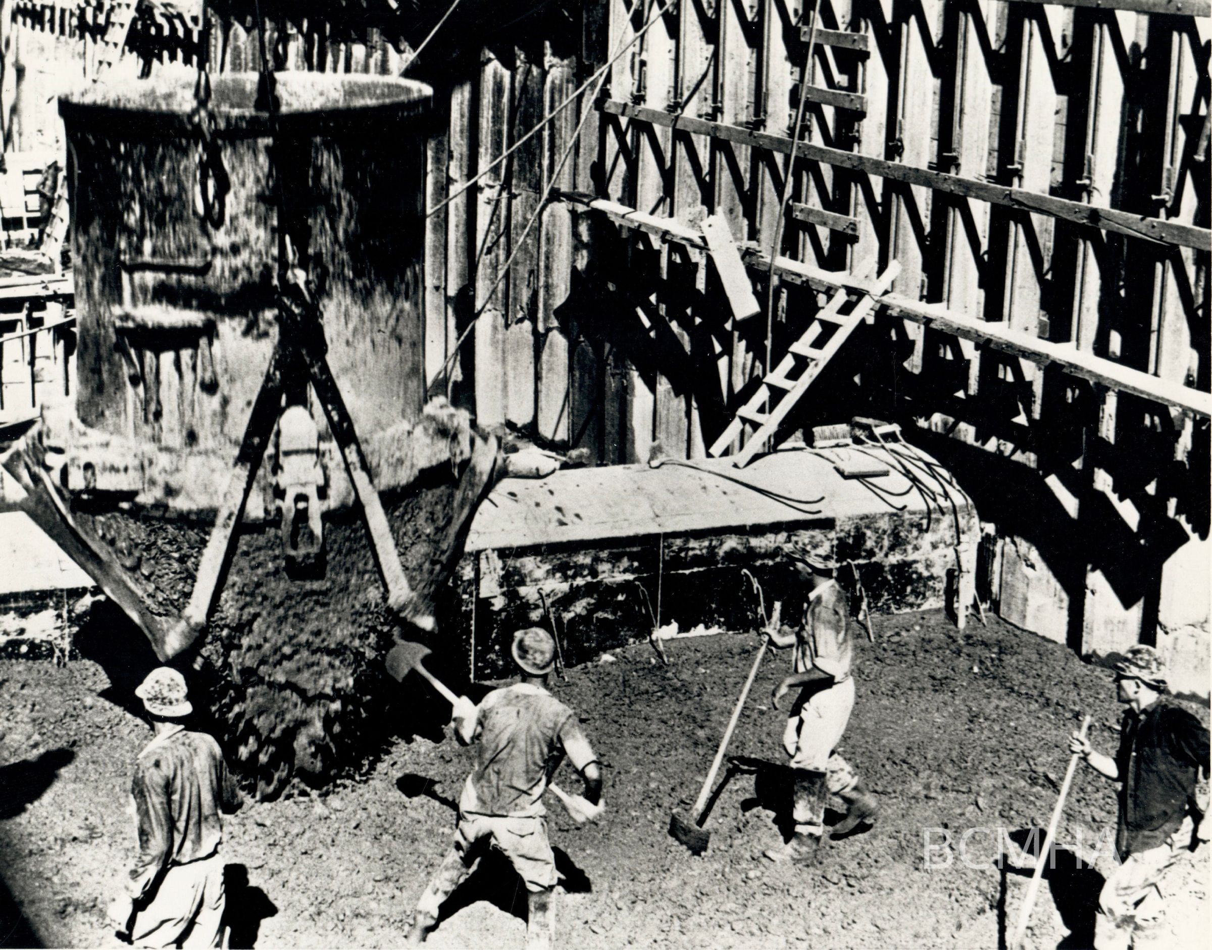 Hoover Dam construction: concrete placement: "Eight-cubic-yard capacity concrete bucket discharging load in dam column form." 9-27-33; B. D. Glaha, photographer; USBR photo no. BCP 02033Collection