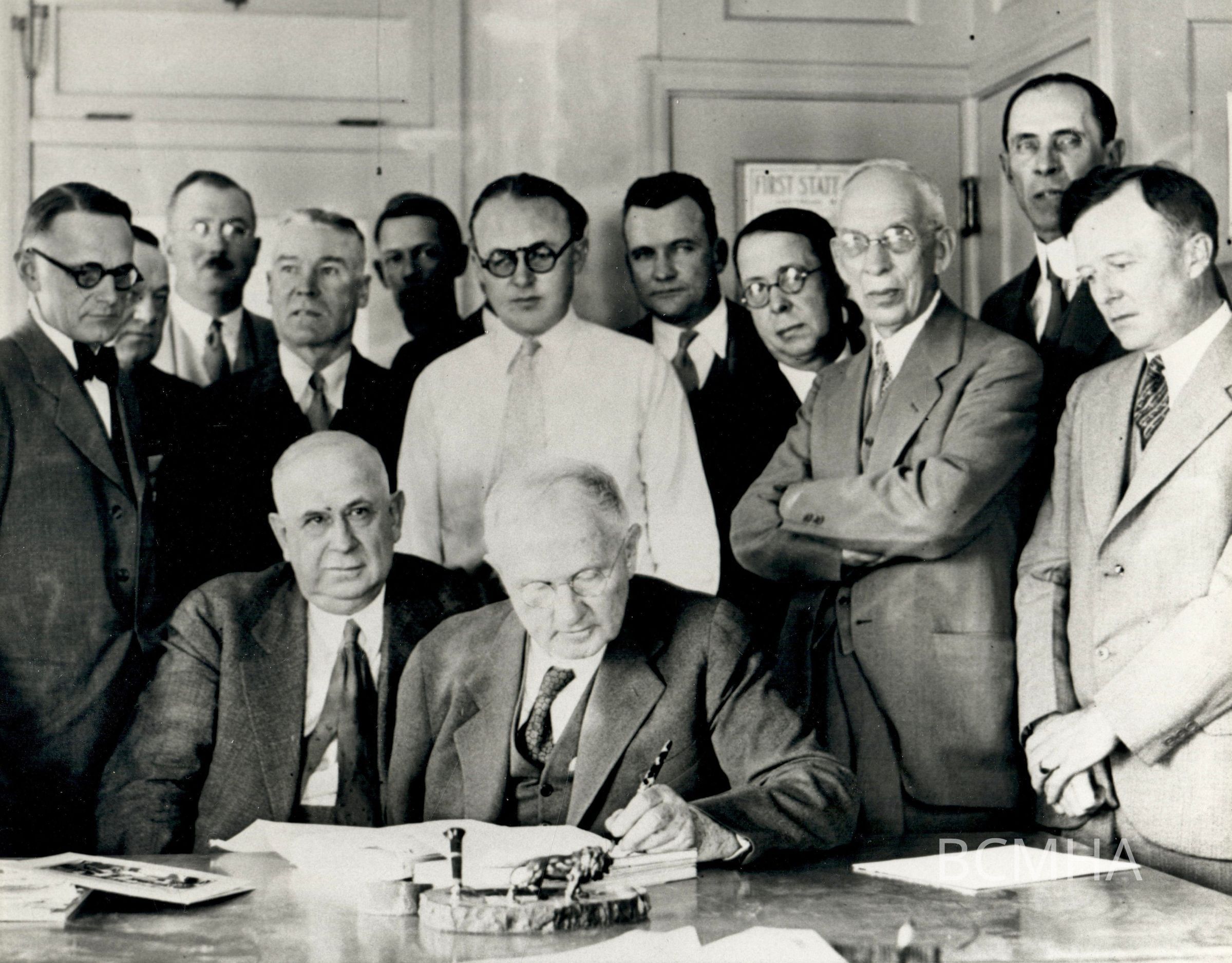 Hoover Dam construction: contract signing: "Signing Contract with the Six Companies, Inc. Seated, R. F. Walter, Chief Engineer and Dr. Elwood Mead (with pen), Commissioner, Bureau of Reclamation; Walker R. Young is standing far left, glasses." 4-18-31; Courtesy of Union Pacific Railroad Neg. HD-332; USBR photo/Copy Negative from Outside CollectionCollection