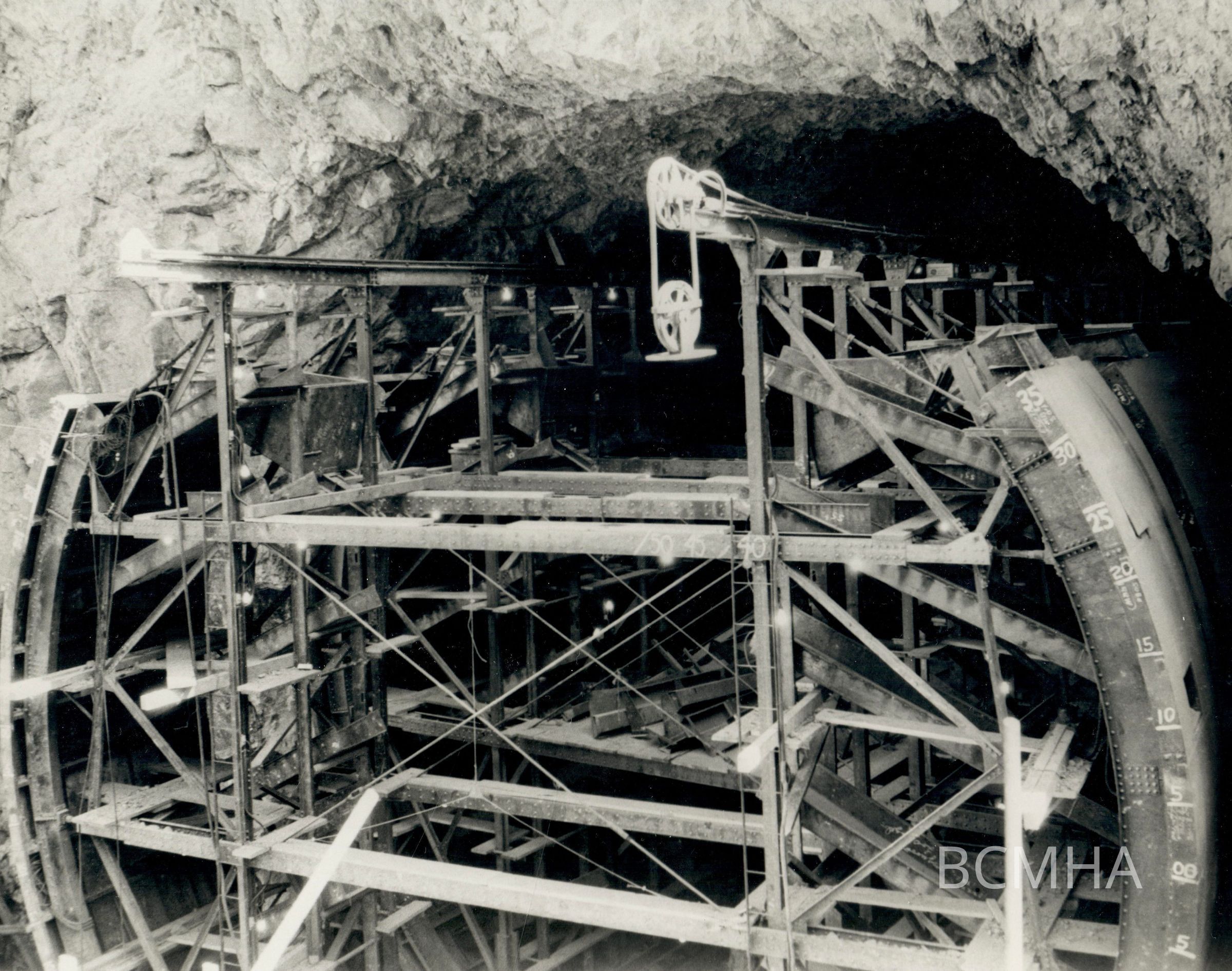 Hoover Dam construction: diversion tunnels: "Detailed picture of the sidewall jumbo used in placing the 3-foot-thick lining in the diversion tunnels. The sidewings are jacked into place and concrete is poured through ports by means of a traveling crane and 2-yard buckets." 4-28-32; W. A. Bechtel Collection Photo #1131 - Volume Two; Roll 20 - Photo No. 4 Copy Negative - Bureau of ReclamationCollection