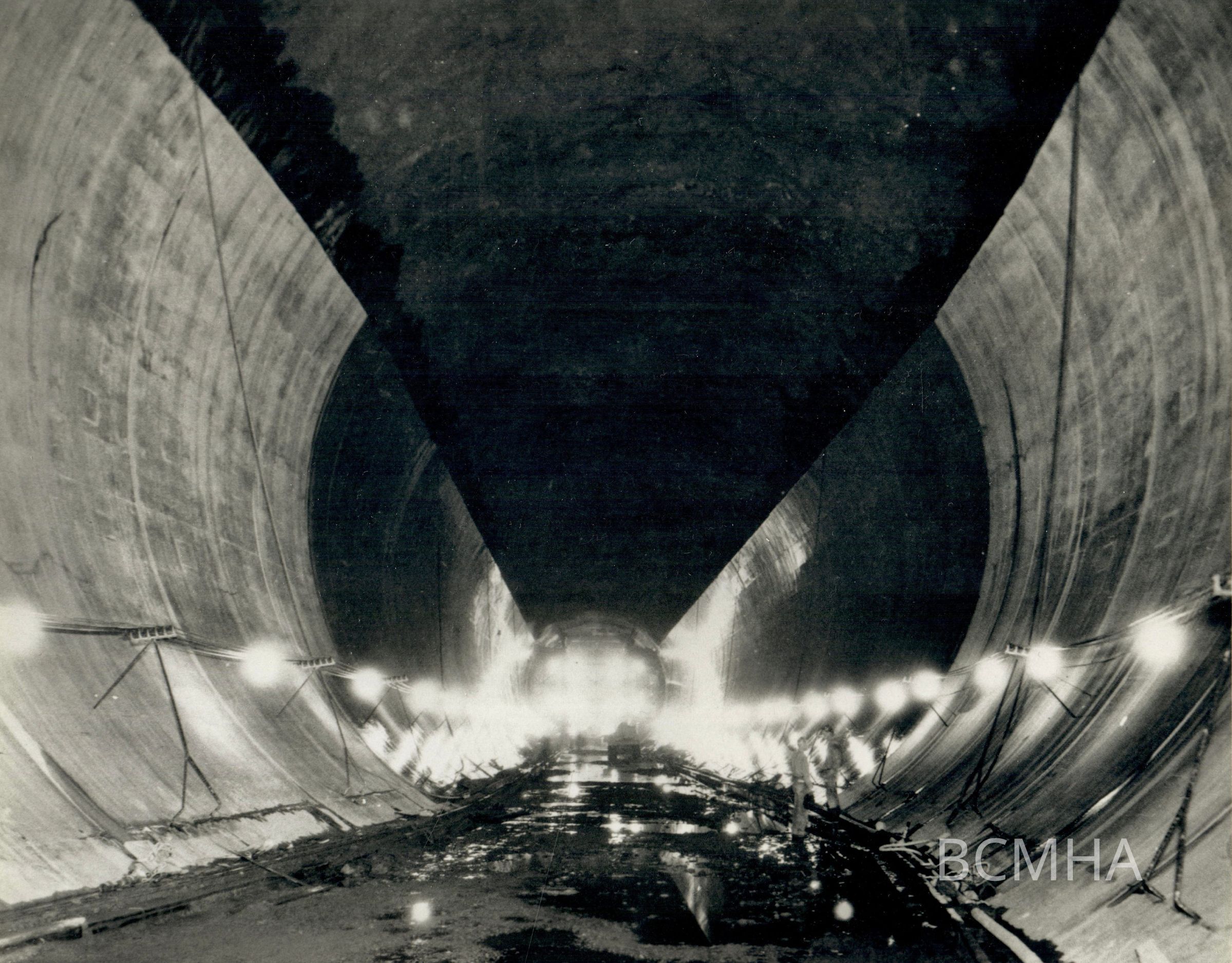 Hoover Dam construction: diversion tunnels: "The interior of Diversion Tunnel No. 3 near the upper portal. The invert and sidewall sections of the 3-foot-thick concrete lining have been poured." 6-2-32; W. A. Bechtel Collection Photo #1219 - Volume Two; Roll 21 - Photo No. 8 Copy Negative - Bureau of ReclamationCollection