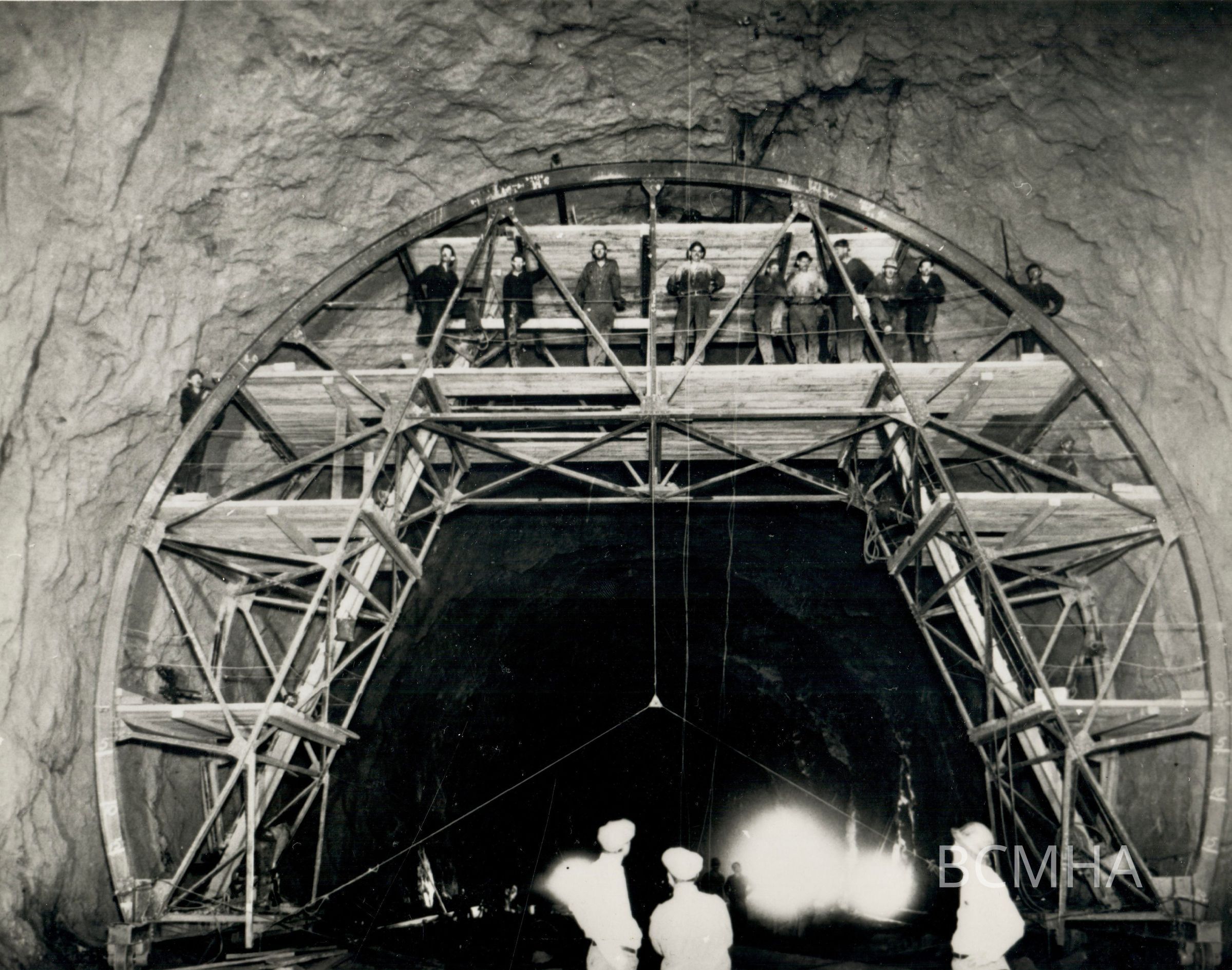 Hoover Dam construction: diversion tunnels: "Trimming jumbo." 4/12/32; 0100 0372 neg. folder 100-15 Manis Collection; UNLV Library - Special Collections Copy Negative; USBR photoCollection