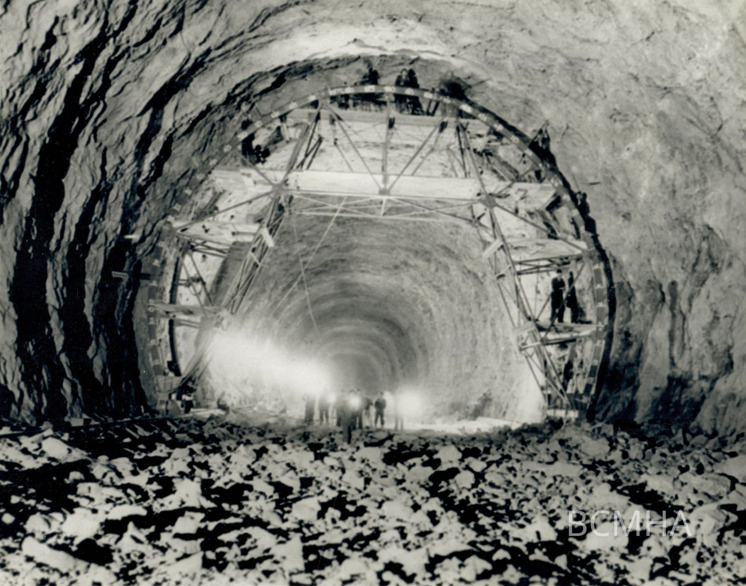Hoover Dam construction: diversion tunnels: "Graphic Views of Hoover Dam - The tunnel trimming gauge used for truing up the 56-foot bores before pouring the concrete linings in the diversion tunnels." Circa 1932; W. A. Davis Collection Photo #114; Roll 13 - Photo No. 5 copy Negative - Bureau of ReclamationCollection