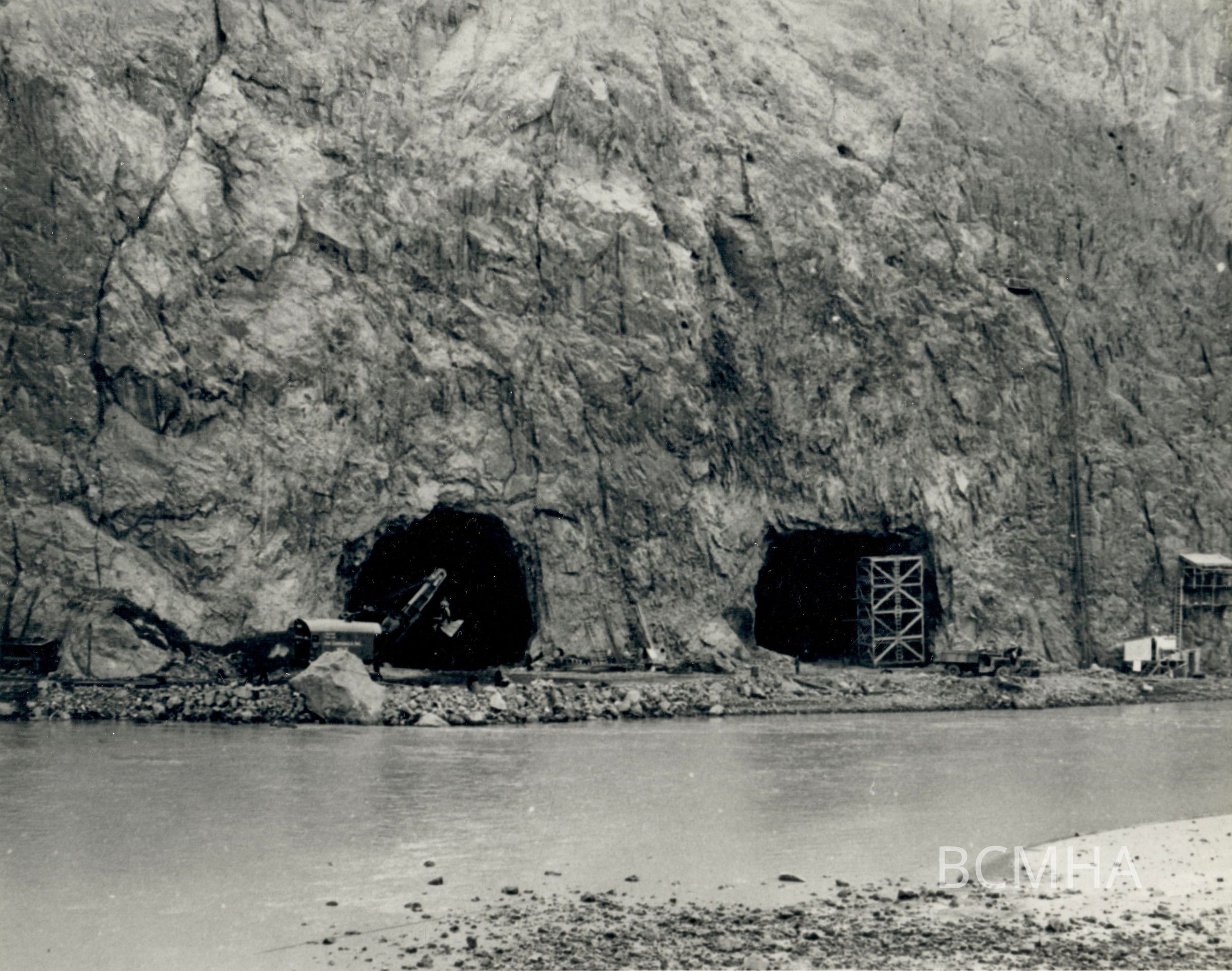Hoover Dam construction: diversion tunnels: "Graphic Views of Hoover Dam - Upper portals of diversion tunnels, Nos. 3 and 4." Circa Early 1932.; W. A. Davis Collection Photo #109; Roll 13 - Photo No. 3 Copy Negative - Bureau of ReclamationCollection