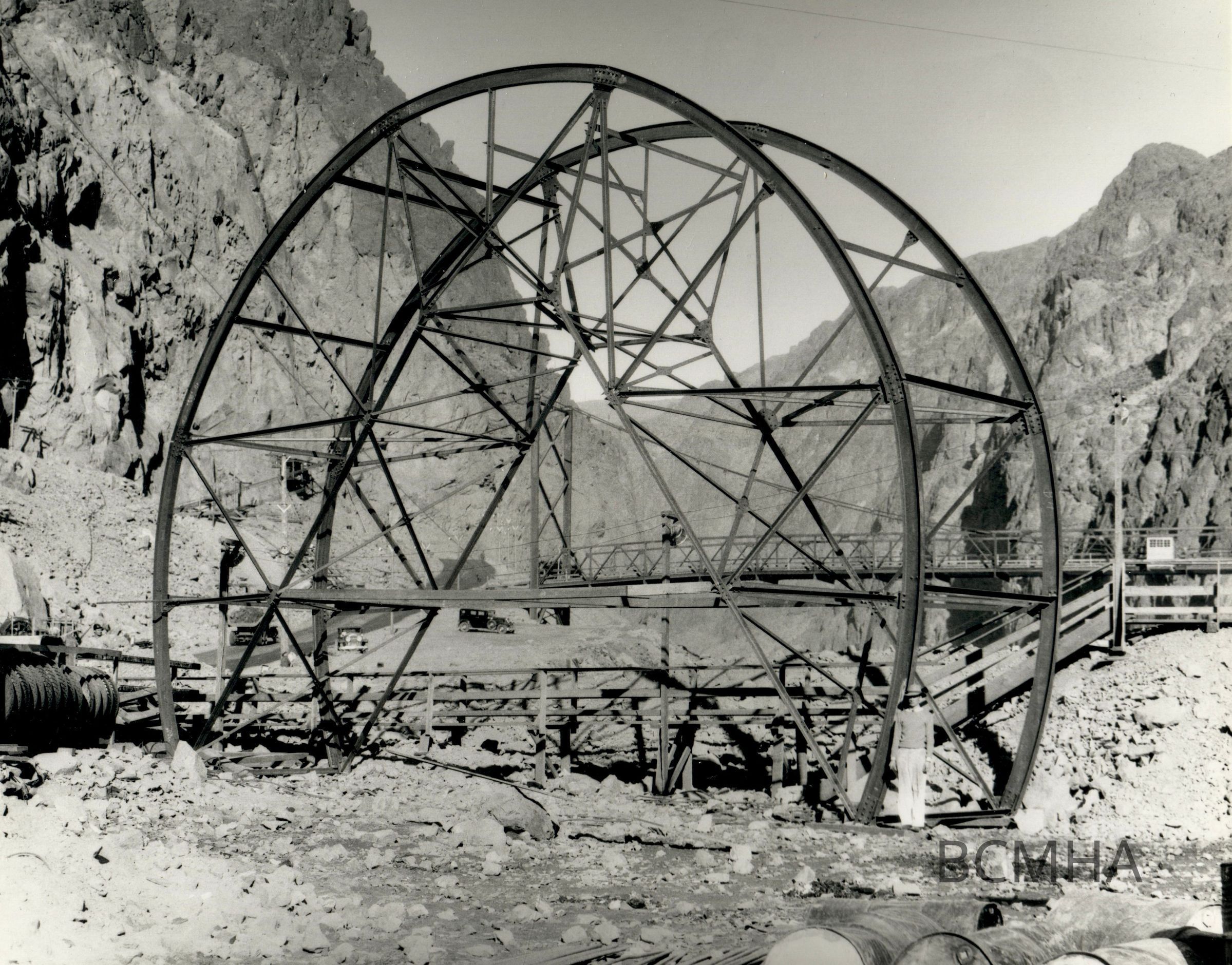 Hoover Dam construction: diversion tunnels: "Steel frame template used in truing and measuring the upper 36' of the diversion tunnel excavations prior to taking out the invert material. Template is 50' in diameter and when in operation is fitted with platforms and trucks which run over rails located on true tunnel alignment." January 15, 1932; B. D. Glaha, photographer; USBR photo no. P45-301-1019 NACollection