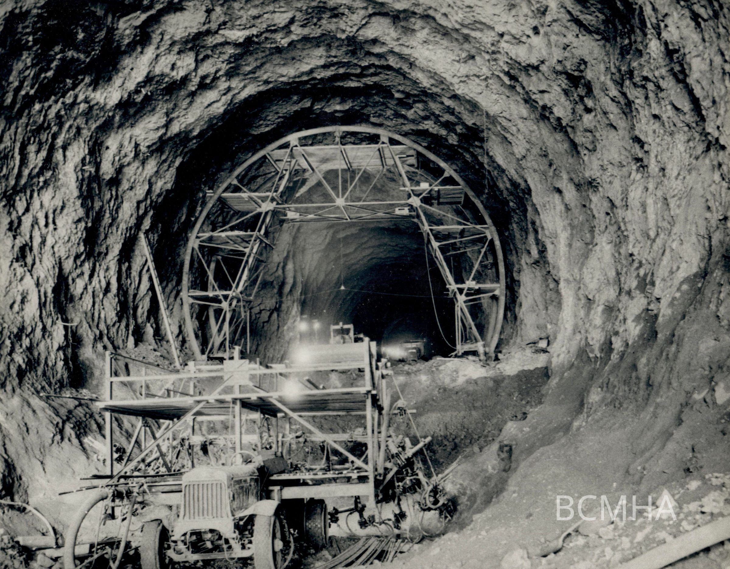 Hoover Dam construction: diversion tunnels: "Diversion Tunnel No. 4. Drilling jumbo for removing invert in foreground. Trimming jumbo for removing projecting rock in the background." 2-5-32.; W. A. Bechtel Collection Photo #863 - Volume Two; Roll 15 - Photo No. 2 Copy Negative - Bureau of ReclamationCollection