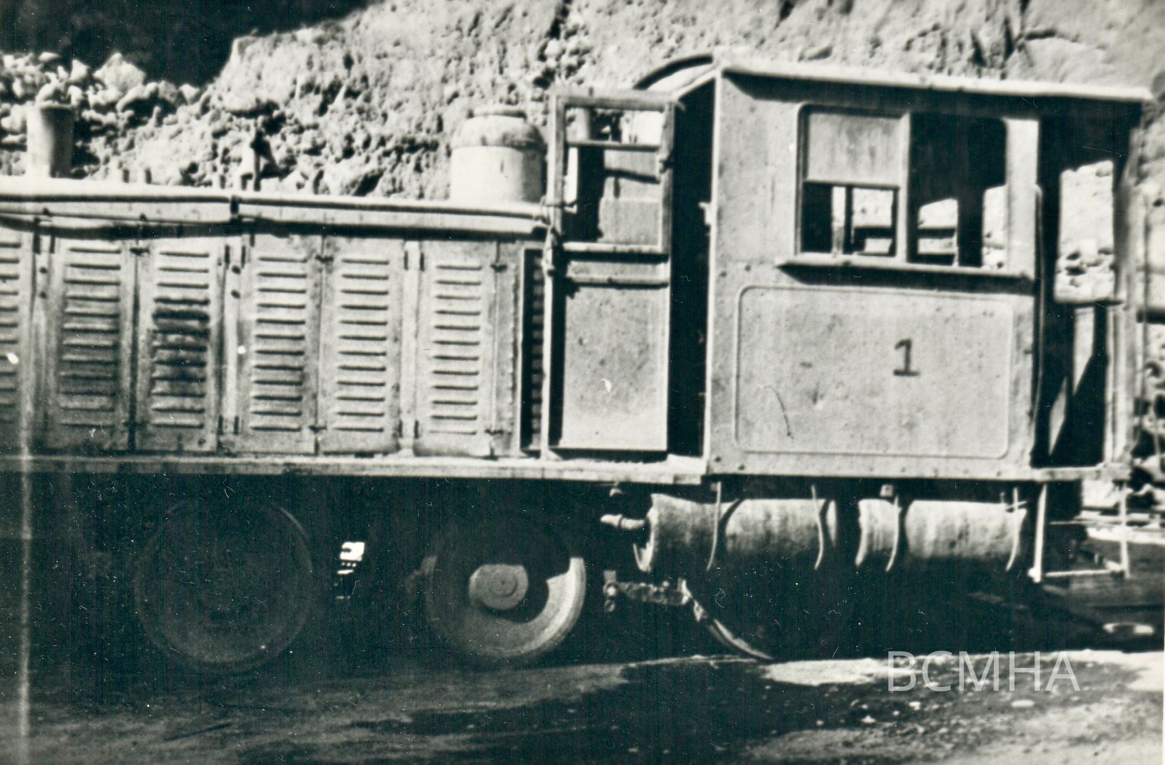 Hoover Dam construction: equipment: "A gasoline-driven dinky engine which hauled concrete from the hi-mix concrete plant to the edge of the canyon. 1933"; TFCollection