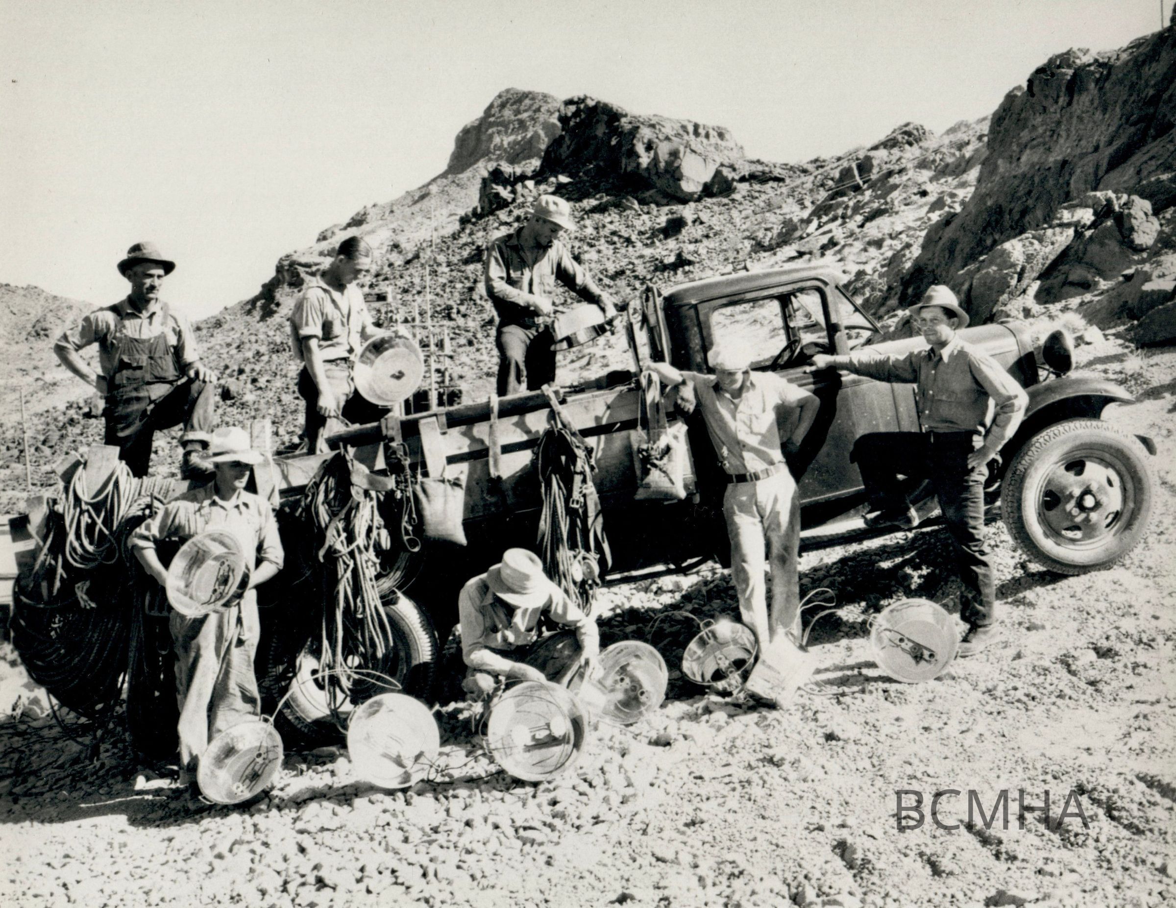 Hoover Dam construction equipment: "Visitors to the project are struck with the multiplicity of dishpans used as reflectors, which are scattered all over the project where night works is carried on. This is the crew that installs them." 8-15-32; W. A. Bechtel Collection Photo #1446 - Volume Two; Roll 25 - Photo No. 2 Copy Negative - Bureau of ReclamationCollection