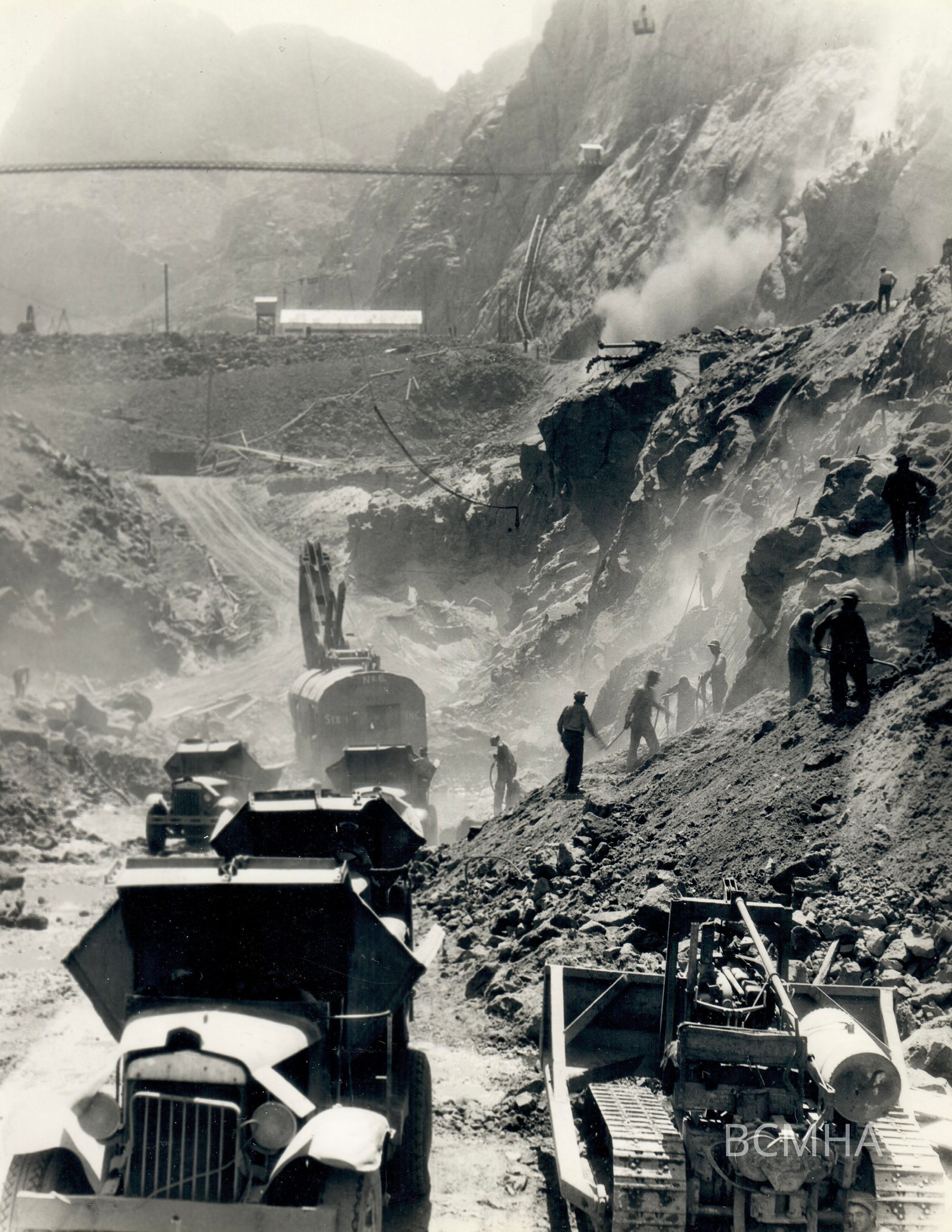 Hoover Dam construction: foundation excavation: "Operations at downstream end of foundation excavation. View looks downstream toward lower coffer dam." 4-29-33; B. D. Glaha photo; USBR/BCP 01639Collection