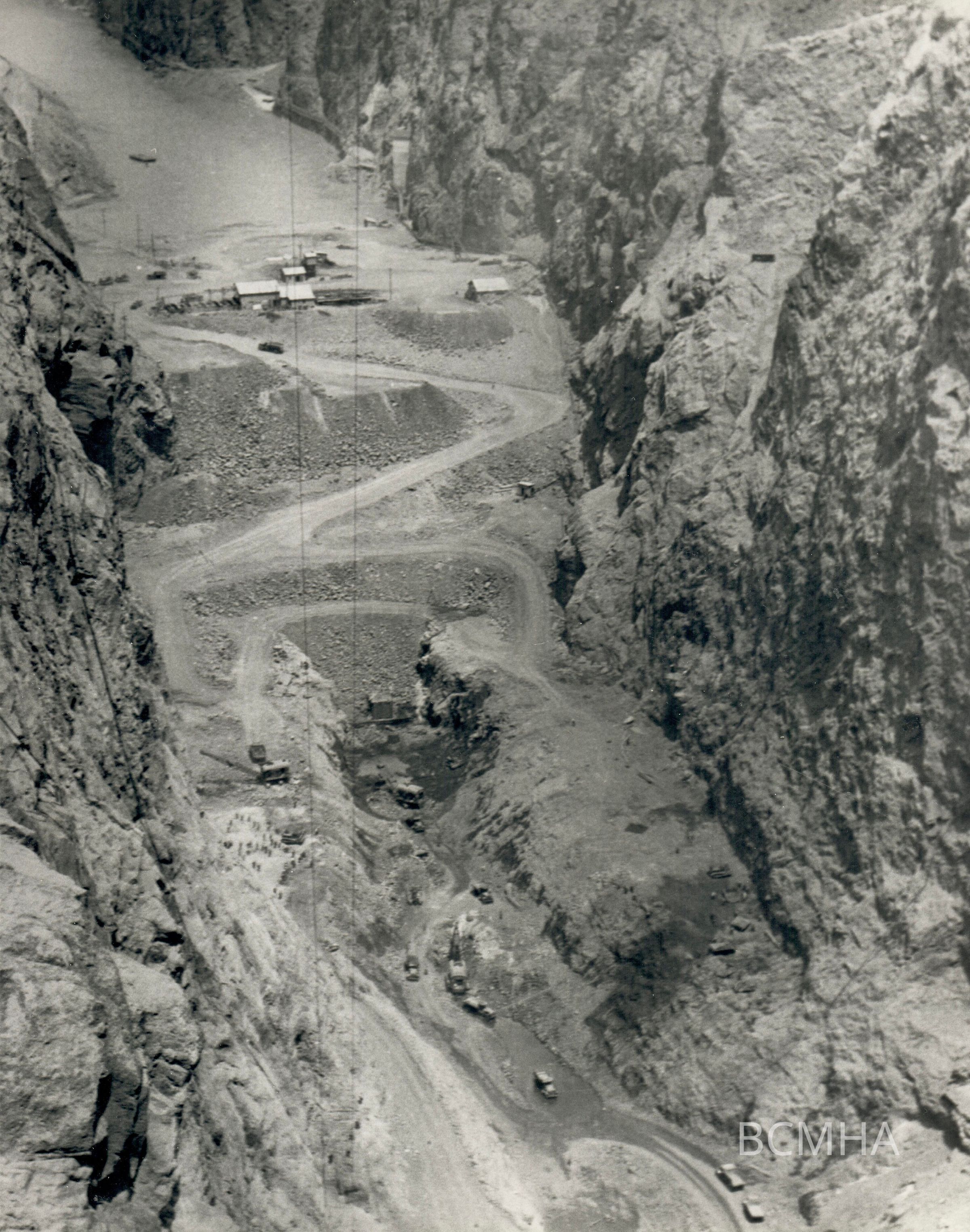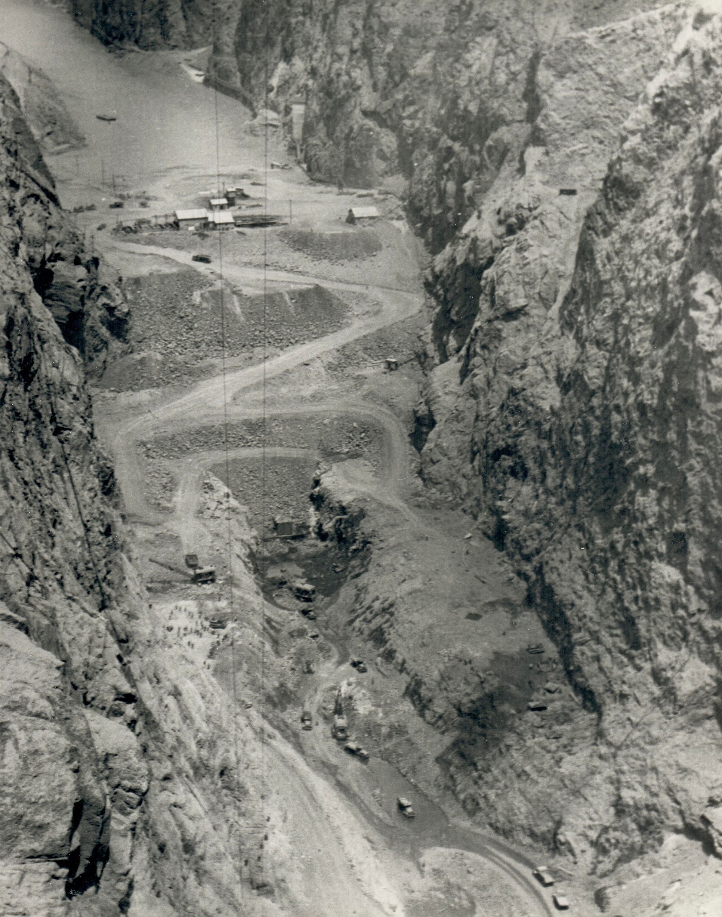 Hoover Dam construction: foundation excavation: "Looking down into dam foundation excavation from near Lookout Point on the Nevada rim. This view shows excellently the benching at the sides and the middle gorge." 5-17-33; B. D. Glaha, photographer; USBR/BCP 01701Collection